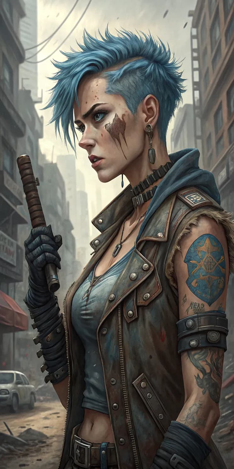 A bold illustration of a female character in a post-apocalyptic urban setting. The character has short, spiky blue hair and wears a tattered leather jacket with metal studs. She holds a makeshift weapon crafted from scrap metal in her left hand. Her right hand is clenched in a fist, showcasing fingerless gloves. Her skin is rugged with dirt smudges, and her expression is fierce and determined. A barcode tattoo is visible on her neck. The background is a desolate cityscape with crumbling buildings and a smoky sky, evoking a sense of survival and resilience. The style is gritty and dynamic, with a focus on stark contrasts and urban decay, typical of post-apocalyptic art.