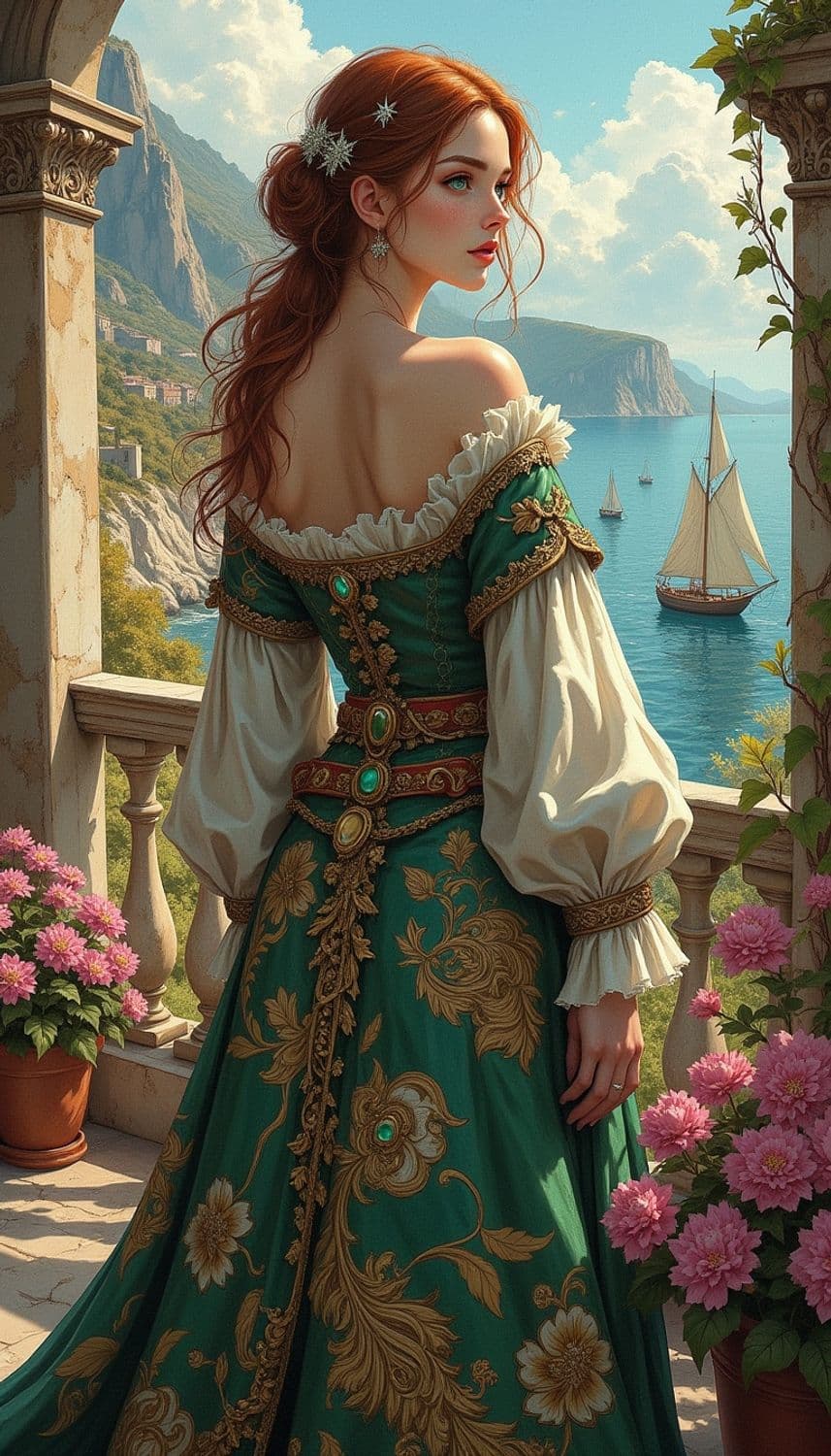 A regal woman with red hair elegantly styled, adorned with jeweled hairpins and delicate earrings, overlooks a scenic sea view from a stone terrace. She is wearing a lavish green gown with intricate gold embroidery, silk puffed sleeves, and gem-encrusted belt. Potted pink flowers and majestic sailing boats can be seen in the background against a picturesque cliffside.