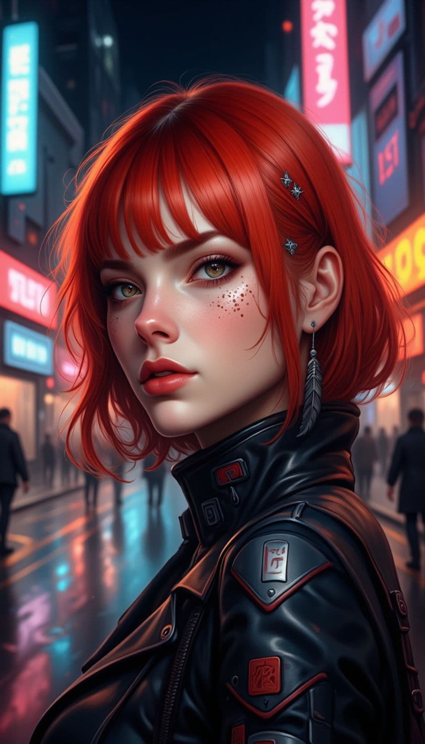 A striking portrayal of a woman with vibrant red hair and a fierce expression, set against a neon-lit city backdrop.