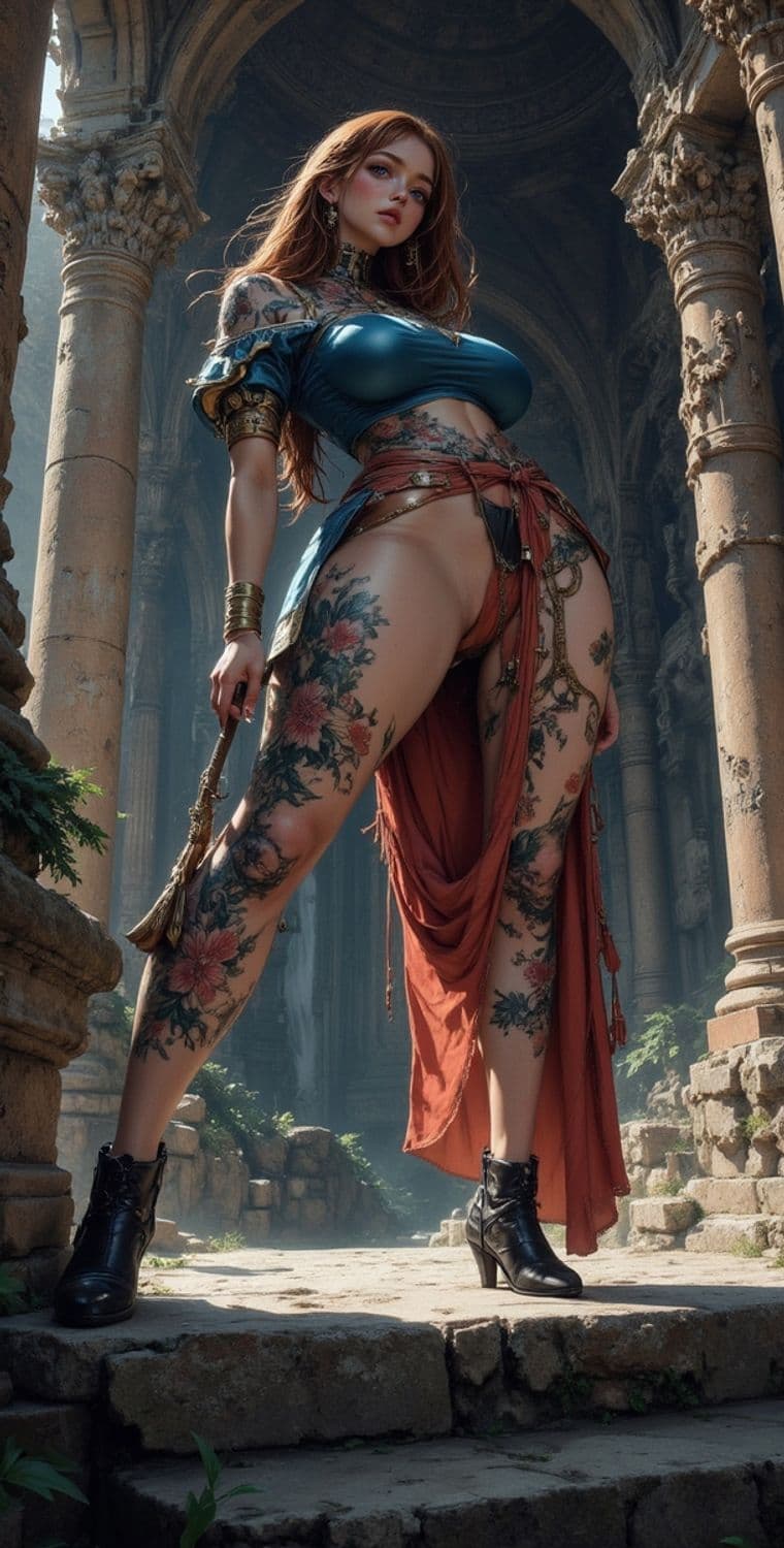A fierce warrior stands poised in ancient ruins. Her attire is a mix of modern and ancient styles, featuring a metallic blue top and a flowing red skirt with intricate belts. Her body is adorned with an array of floral tattoos that extend from her shoulders down her legs. The setting is an ancient stone structure with grand arches and pillars, suggesting a mystical aura.