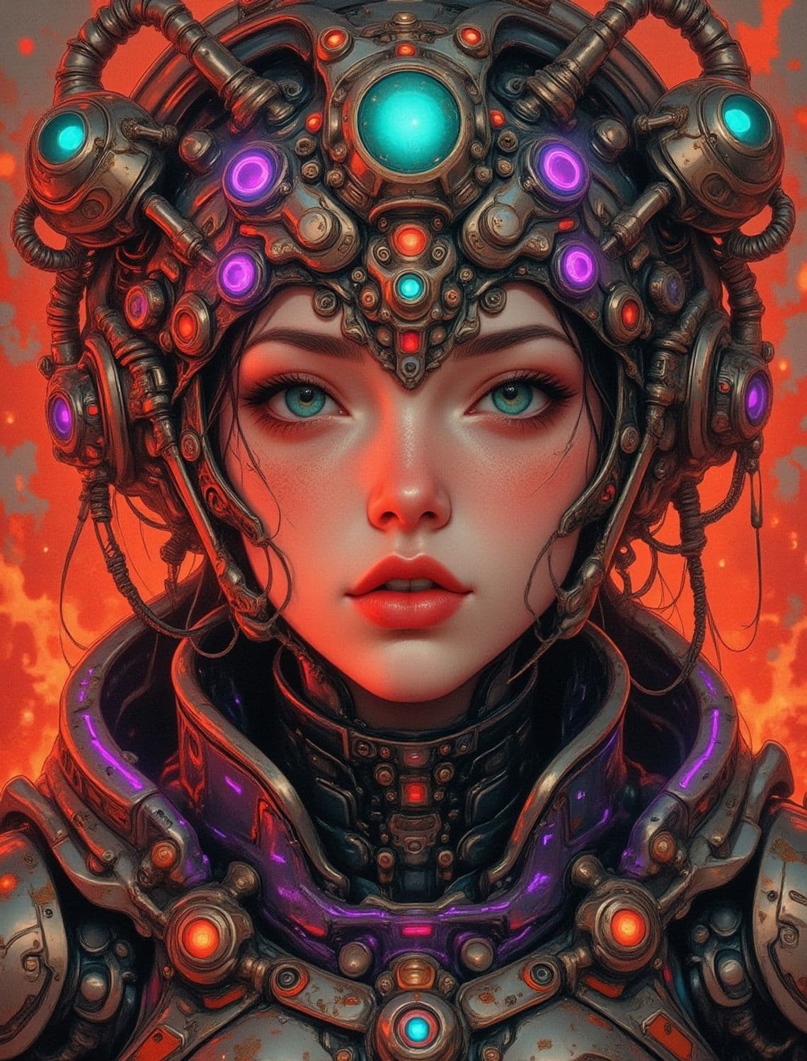 A futuristic female figure with striking features is adorned in an intricate mechanized headpiece. The headgear is a complex assembly of metallic components, glowing with blue and purple lights. Her expressive eyes and vividly rendered lips contrast with the cybernetic elements. The background is a vivid red, enhancing the otherworldly atmosphere of the image.