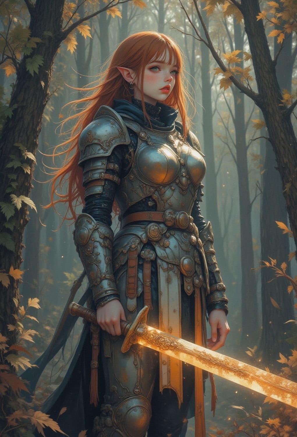 In a mystical forest setting, an armored elf with flowing red hair stands poised, her expression calm yet fierce. Her intricately designed armor gleams softly in the forest light, while her pointed ears peek through her cascading hair. She holds a glowing, enchanted sword that reflects the rich hues of the autumn leaves around her. The background is a blend of trees with their golden and orange foliage, adding a magical aura to the scene.