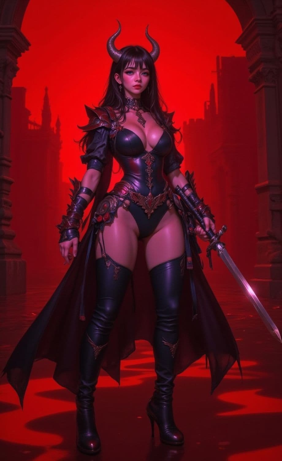The image features a powerful and fierce warrior standing confidently in a dramatic setting with a red backdrop. She has long dark hair and is adorned with horns on her head. Her attire is a combination of armor and a cape, with intricate designs and leather elements. She holds a sword, ready for battle, with an expression of determination.