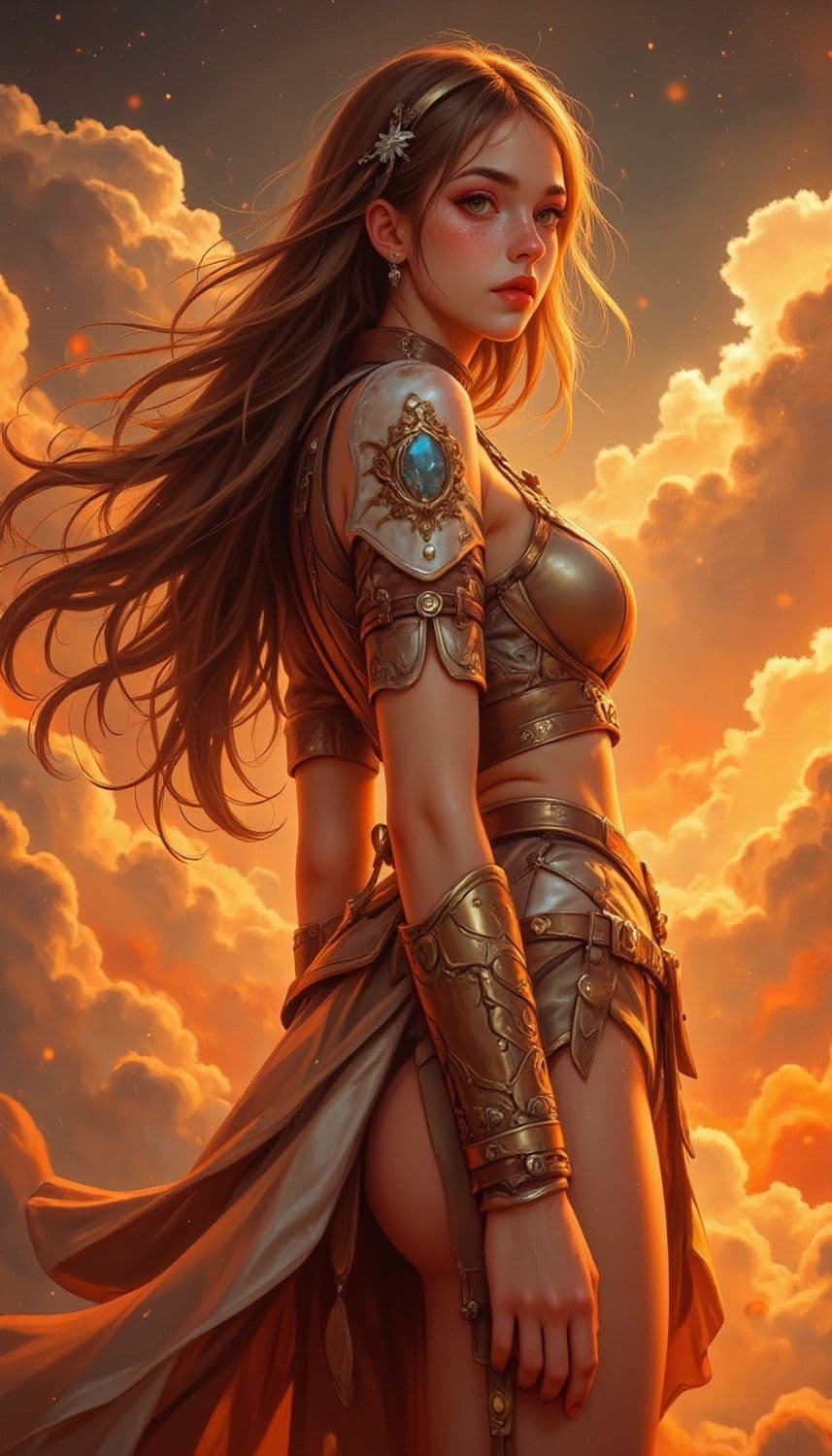 A warrior-like woman with flowing hair stands confidently against a backdrop of glowing clouds. She wears ornate armor adorned with a blue gem, and her expression is serene yet fierce.