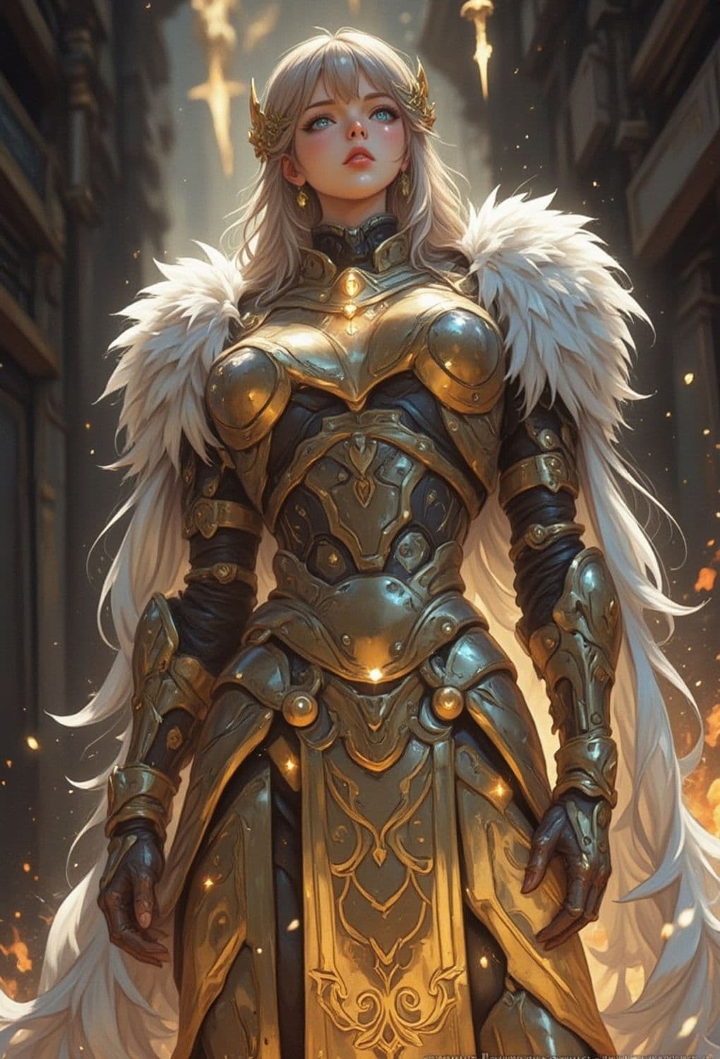 A majestic figure stands confidently amidst a mystical, atmospheric scene. Dressed in ornate golden armor adorned with intricate patterns, the character exudes strength and power. Her armor includes elaborate shoulder pads resembling wings, adding to her regal appearance. Long, flowing hair complements her ethereal look, and a serene expression on her face suggests calmness amidst chaos. Fiery elements hover softly in the background, enhancing the magical ambiance.