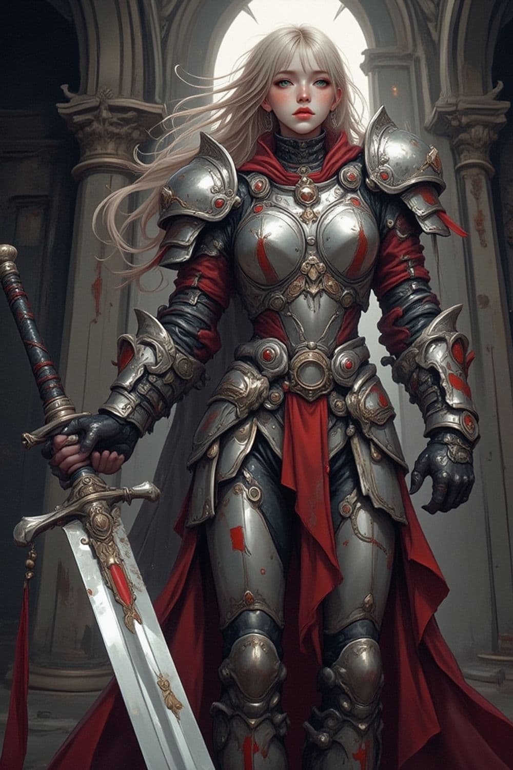 The image depicts a powerful female knight standing confidently. She is clad in intricately detailed silver armor with red accents and holds a large, ornate sword. Her long blonde hair flows freely, and she stands within an ancient stone structure with tall arches, exuding an aura of strength and determination.