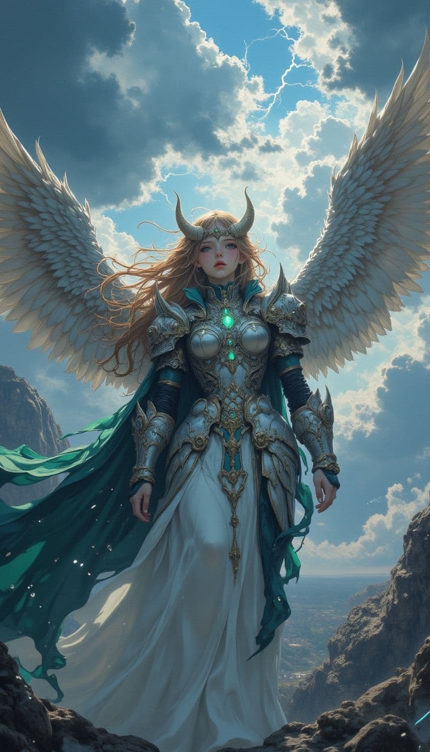 The image depicts a majestic, angelic figure with large, feathered wings, standing amidst a dramatic mountainous landscape. The figure wears intricately detailed armor adorned with glowing gems and a flowing cloak. A crown with horns rests upon their head. The background features a dramatic sky filled with clouds and lightning.