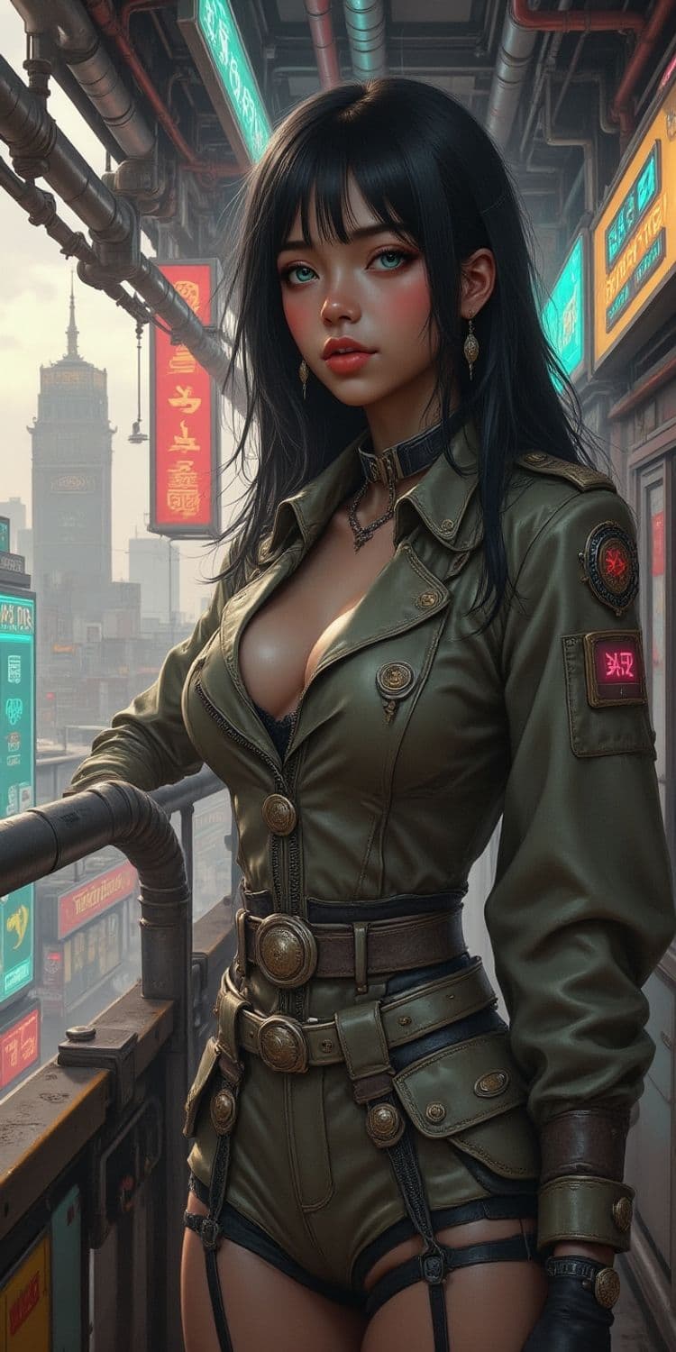A striking character stands on an urban balcony overlooking a cityscape. She is wearing a form-fitting, olive-green jacket with detailed buttons and emblems. Her long, dark hair frames her face, which has vibrant eyes and subtle makeup. The background is filled with neon-lit signs and a mix of modern and industrial architecture.