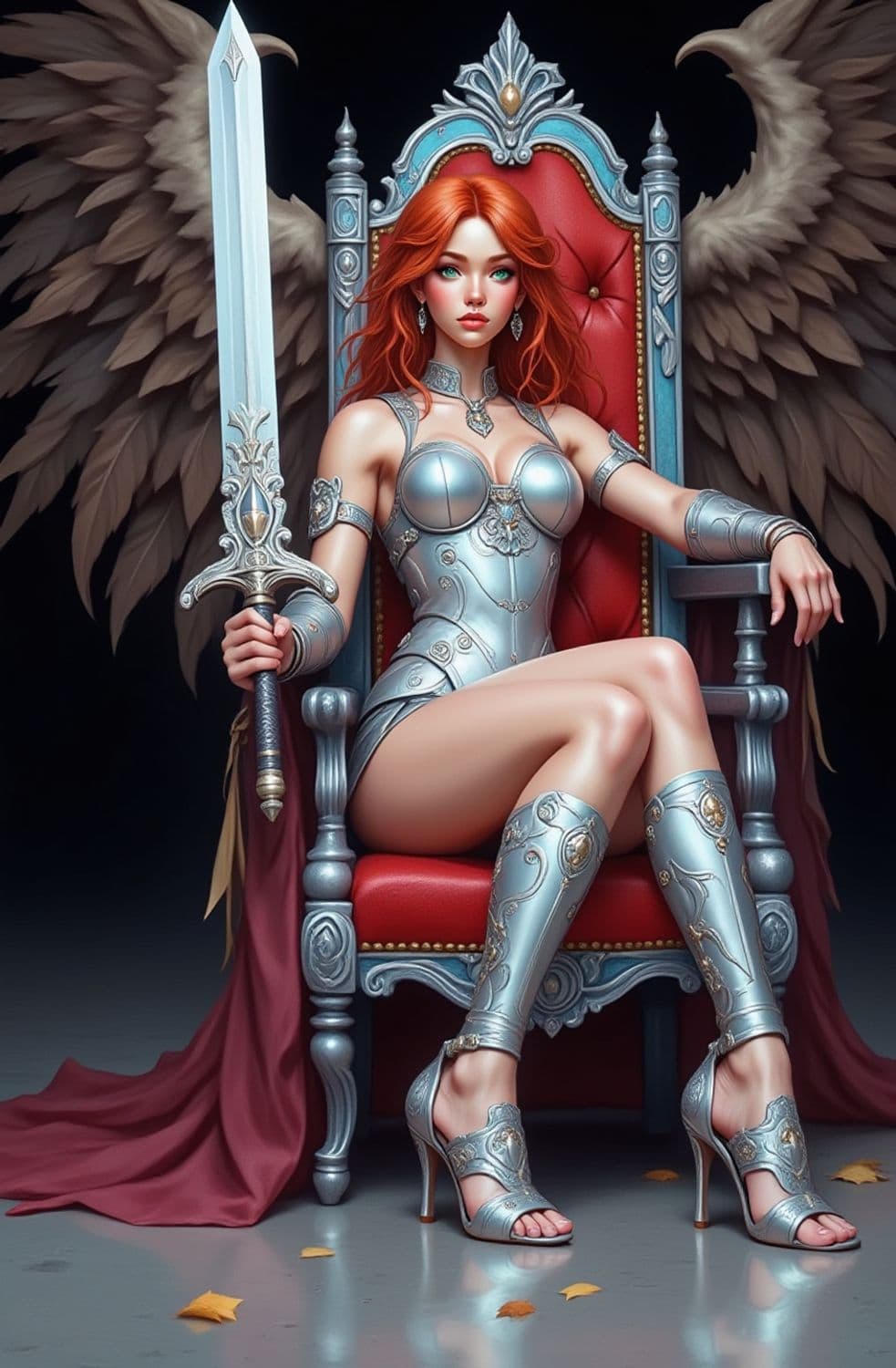 A regal warrior sits with poise on an ornate throne. She wears intricate silver armor and holds an elaborately designed sword. Her striking red hair cascades over her shoulders, complementing her fierce gaze. Large, feathered wings extend from her back, adding an ethereal quality. Fallen leaves at her feet evoke a sense of tranquility amidst her commanding presence.