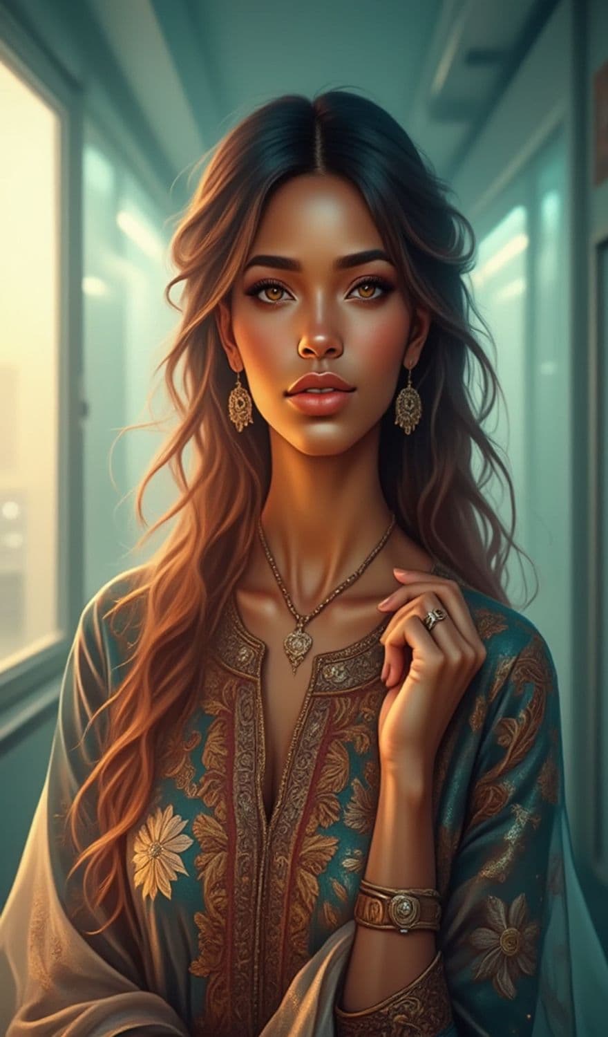 A striking fantasy portrait of a young woman with long wavy hair, adorned in a richly embroidered robe. Her expression is serene and contemplative, with intricate earrings and a pendant necklace enhancing her grace. Soft light filters through the background, adding an ethereal glow.