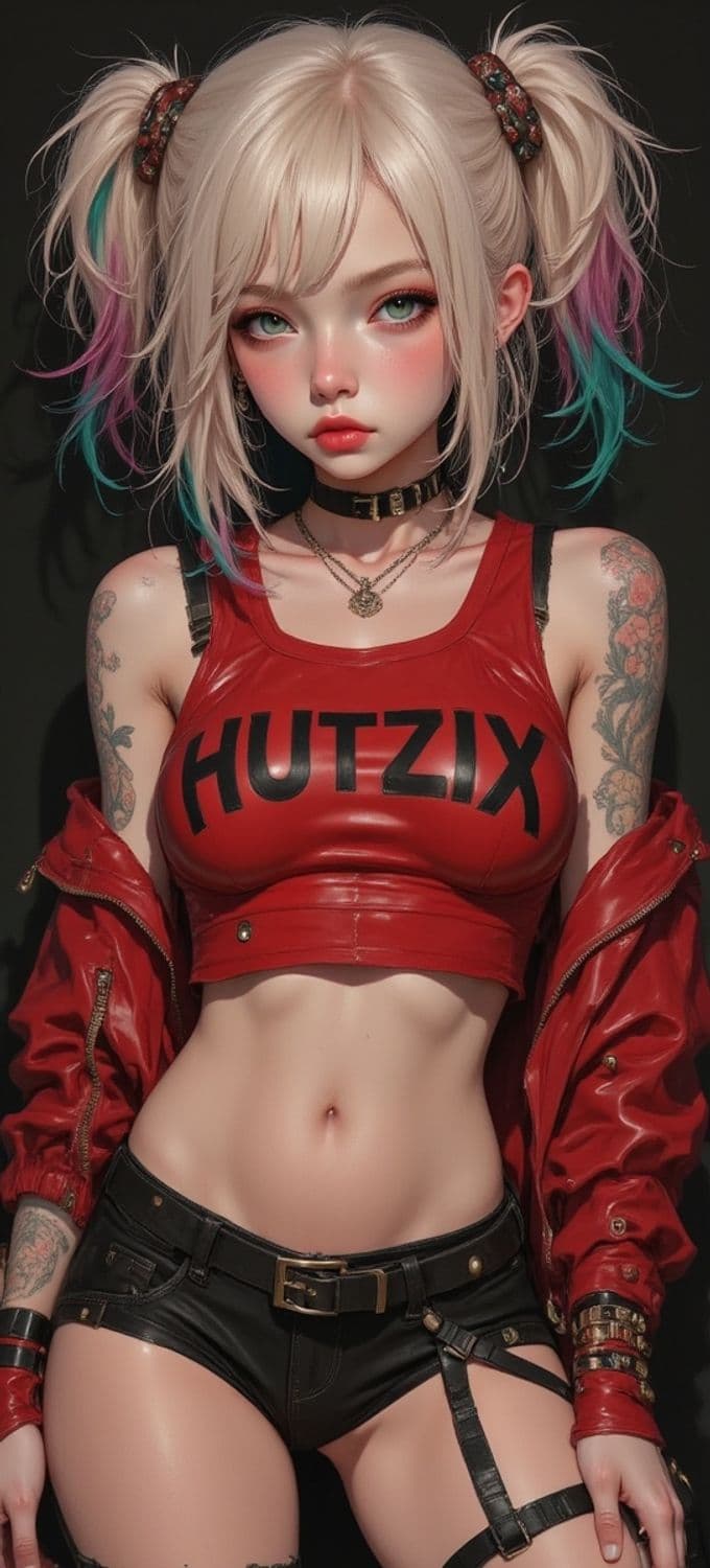 The image features a digital character with strikingly styled blonde hair tied into two pigtails, with colorful streaks. She wears a red crop top with bold black lettering and a matching red jacket draped over her shoulders. Her arms display detailed tattoo work. The character is adorned with a choker and multiple necklaces, giving her an edgy, modern look.