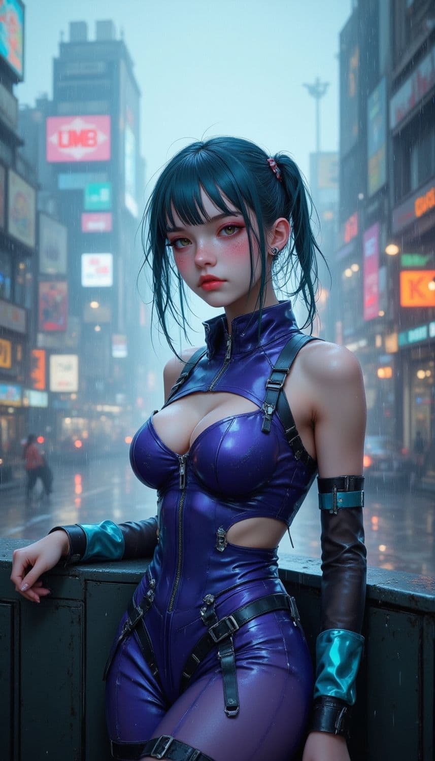 A striking character stands in a rainy urban setting, illuminated by neon lights. She has teal hair styled in ponytails and wears a form-fitting purple bodysuit with black straps. The backdrop is a bustling city street, emphasizing a futuristic or cyberpunk theme.