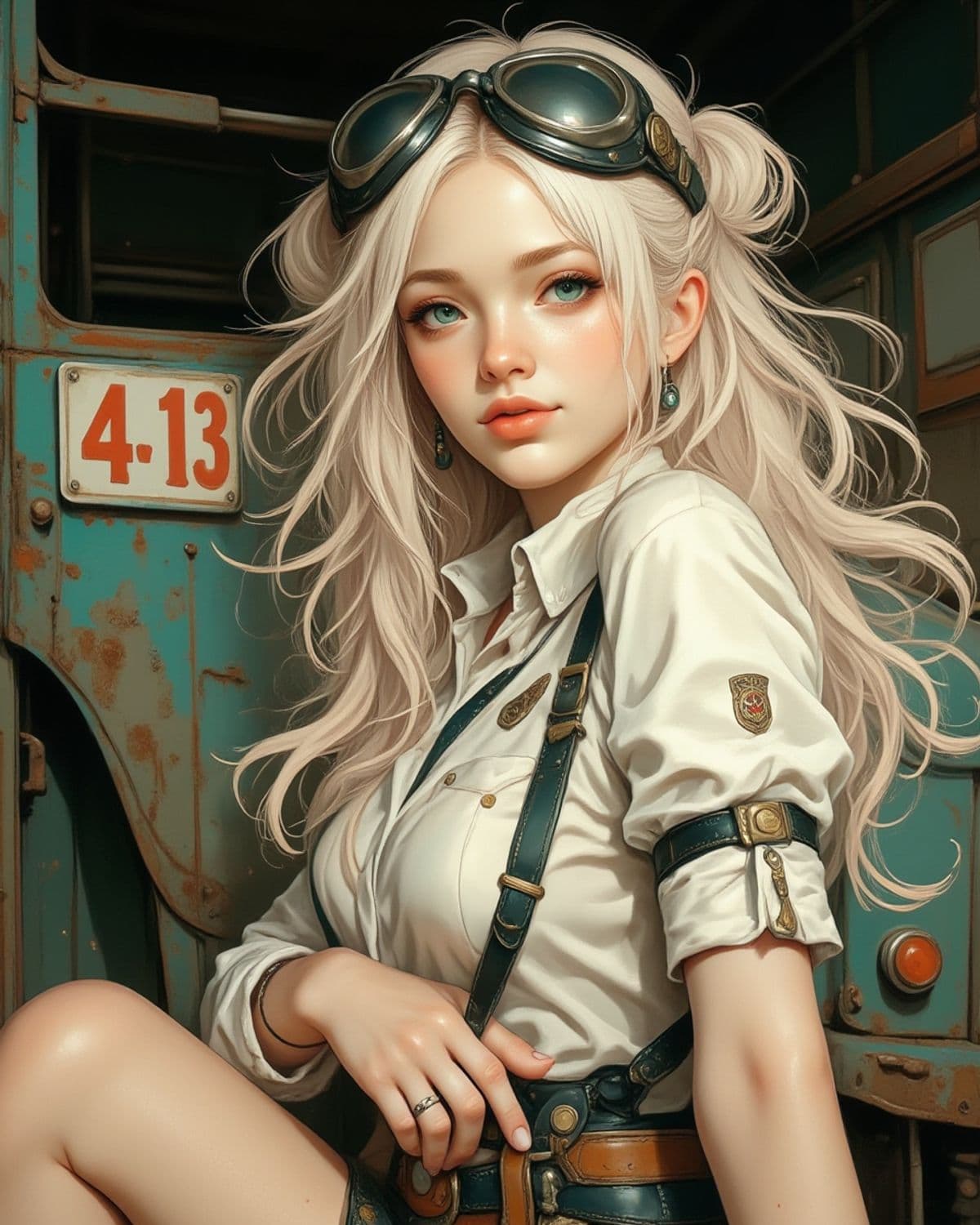 A captivating portrait of a young woman with long, wavy blonde hair, wearing a white, rolled-up shirt and leather suspenders. She has striking teal eyes and a confident expression. On her head are vintage aviator goggles. Behind her is an old, rusted vehicle with the number 4-13.