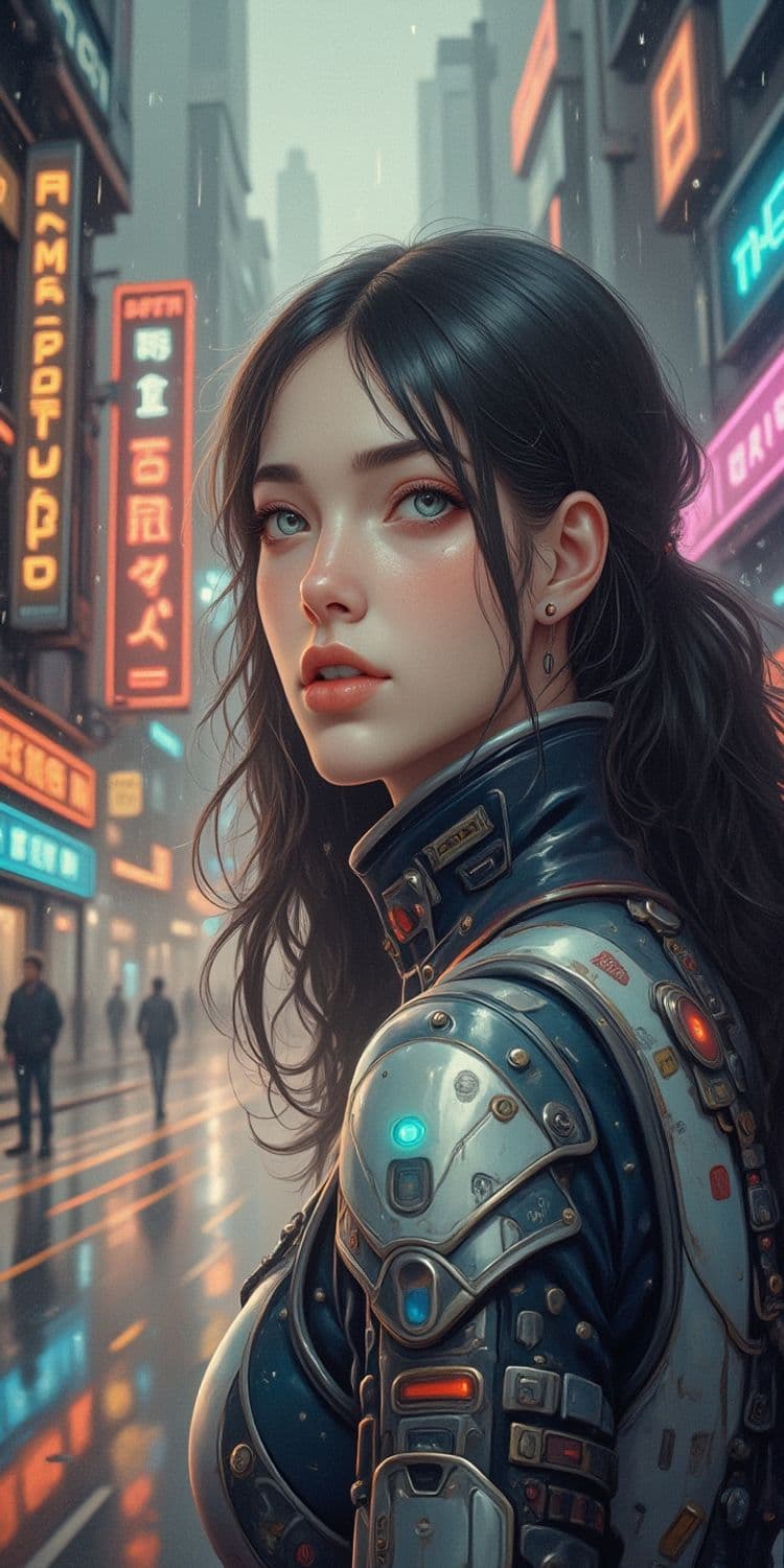A futuristic cityscape serves as the backdrop for a woman clad in an intricately detailed cybernetic suit. Neon signs in various scripts illuminate the bustling street. Her expression is contemplative, highlighted by the glow of her suit's embedded lights. Dark, flowing hair frames her face, adding to the high-tech yet elegant atmosphere.
