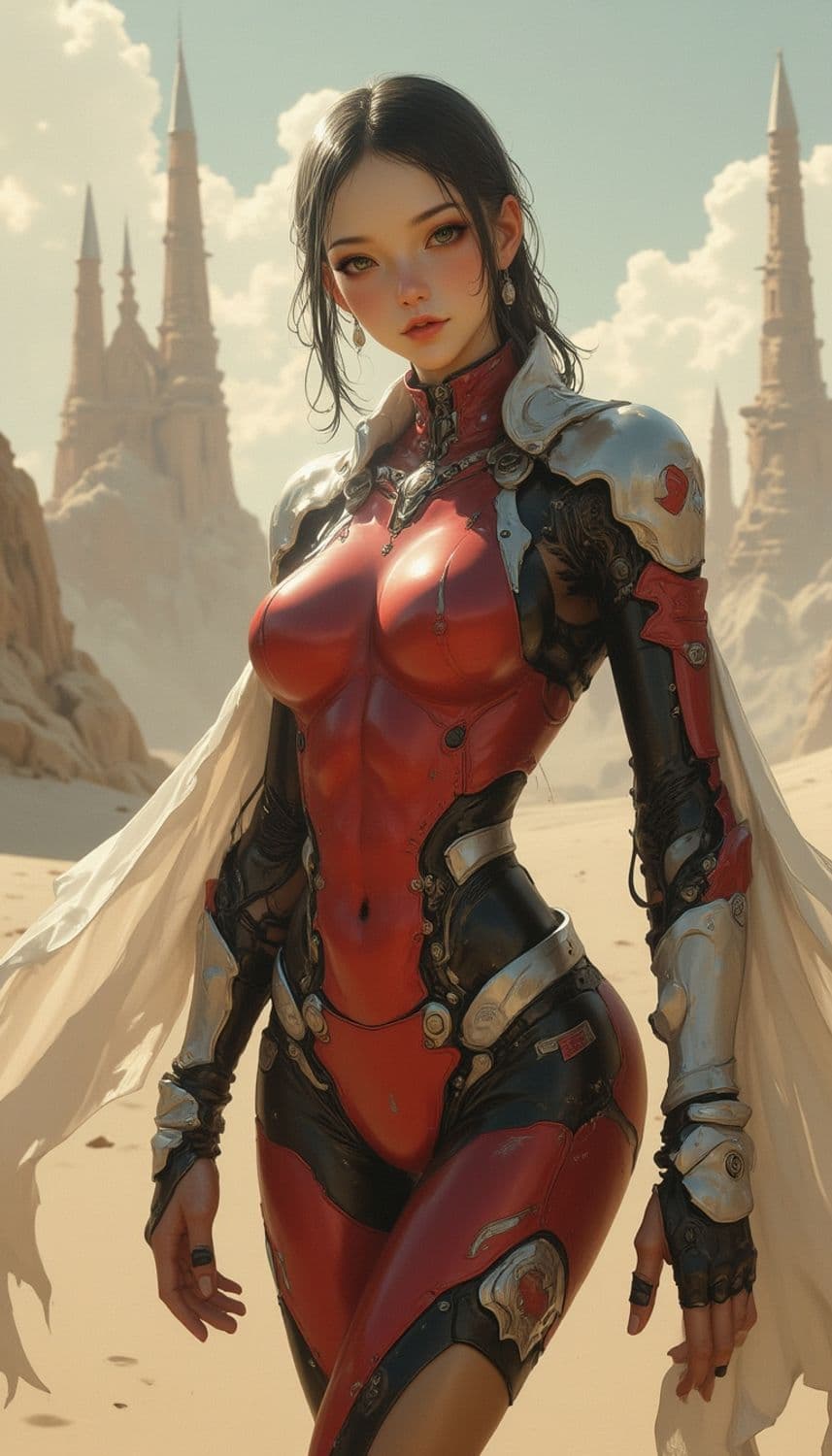 A futuristic figure stands in a desert landscape, clad in a sleek red and black exosuit with silver armor accents. The person has striking features, including green eyes and long black hair. Dramatic desert spires rise in the background, set against a clear sky with fluffy clouds.