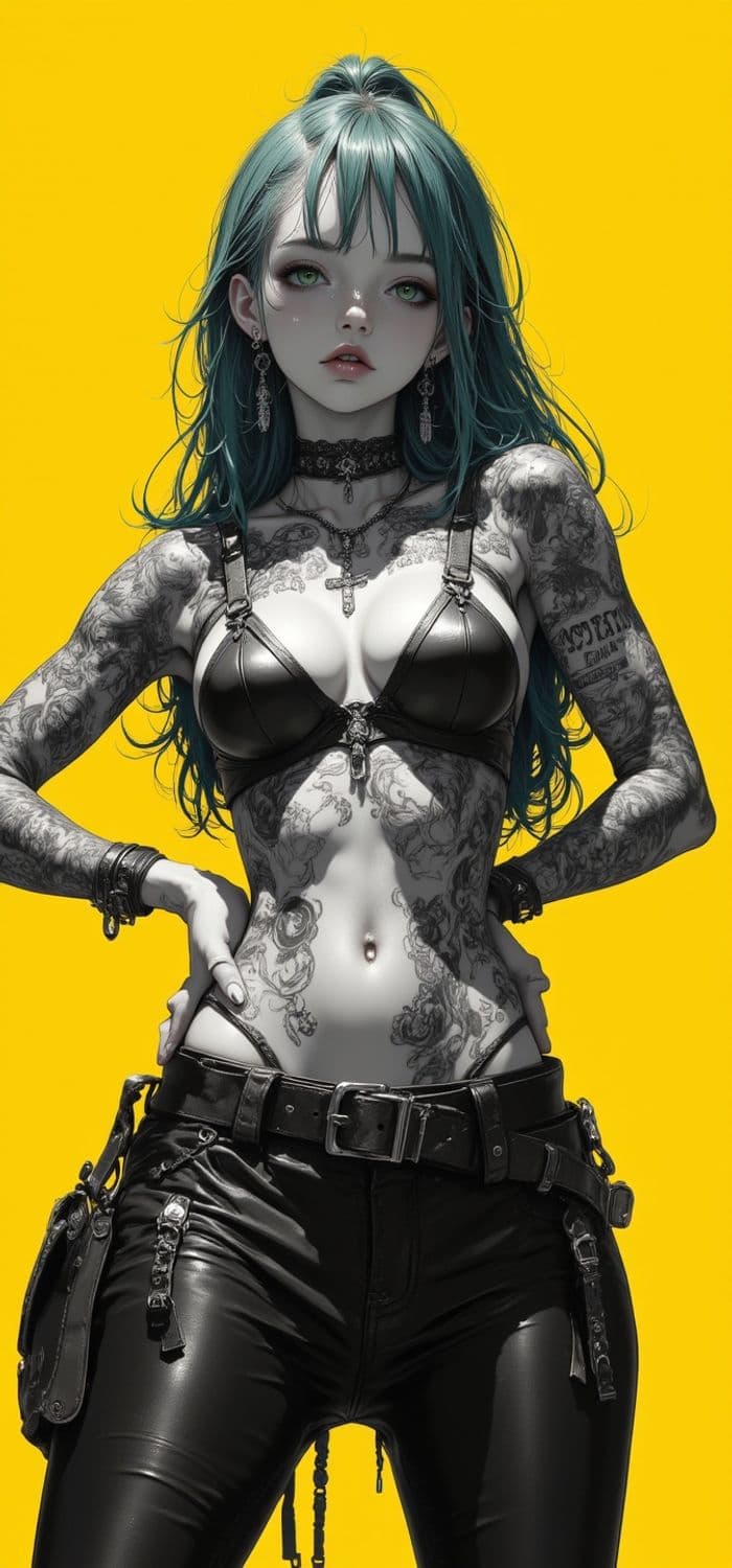 The image portrays an edgy, stylish character with teal hair against a vibrant yellow background. She is adorned with numerous tattoos across her arms and torso and wears a black leather top with matching pants. The character's confident pose, complete with hands on hips, is accentuated by gothic accessories, including a choker, cross pendant, and bracelets.