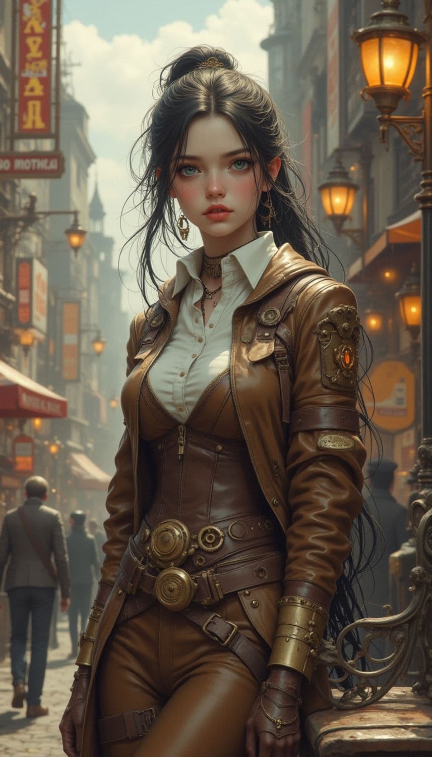 A woman stands confidently on a bustling street, embodying a steampunk aesthetic. She wears a fitted brown leather outfit adorned with brass and gold accessories, such as gears and ornate cuffs. Her long, dark hair cascades down her shoulders, and she gazes forward with a determined expression. The background features vintage-style street lamps and signs, immersing the scene in a nostalgic yet fantastical atmosphere.