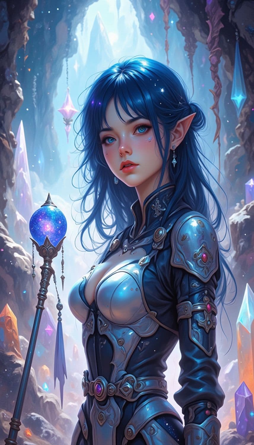 A mystical elf with blue hair and pointed ears stands in a cavern adorned with glowing crystals. She wears intricate armor embellished with silver and jewel-like decorations. In her hand, she holds a staff with a luminous, orb-like tip. The cavern is filled with ethereal light, casting soft hues and sparkles around her.
