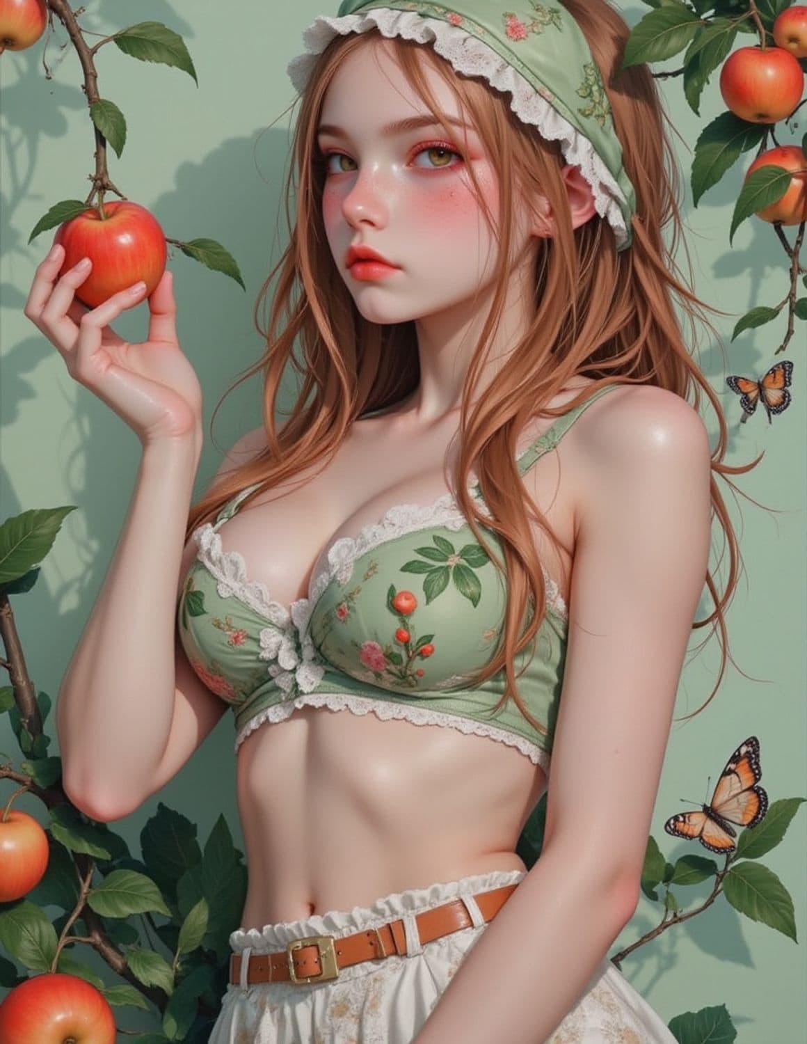 The image features a young woman with long reddish-brown hair, wearing a green headband and a matching green top with floral embroidery. She is holding a red apple in her hand, surrounded by apple branches and a butterfly. The background is a soft green, complementing the verdant theme.