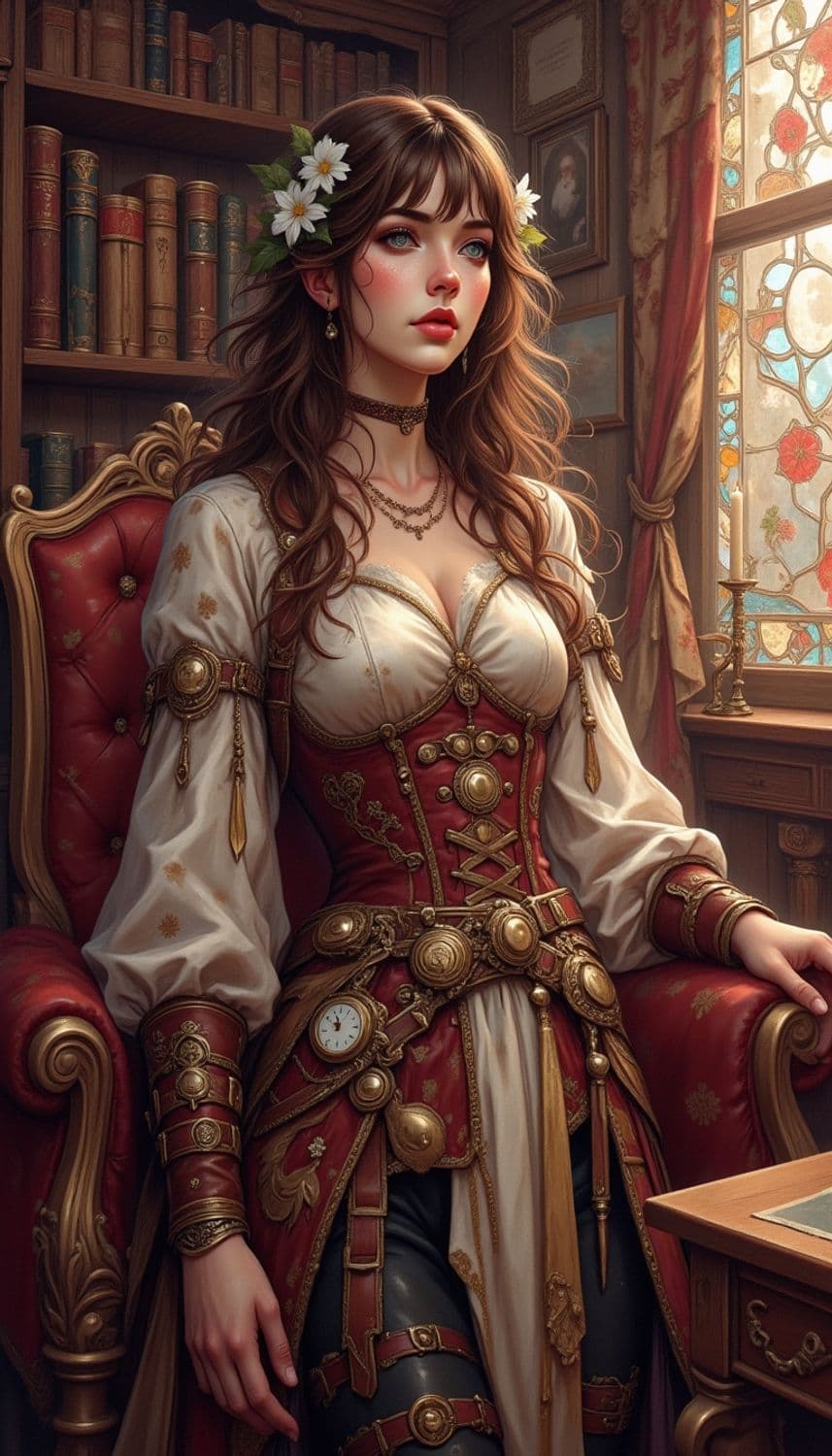 A woman sits gracefully in a luxurious chair, adorned in an elaborate corset and gown with gold embellishments. Her hair, decorated with flowers, cascades across her shoulders. She is positioned in a richly decorated room with bookshelves and stained glass windows, exuding a sense of elegance and mystery.