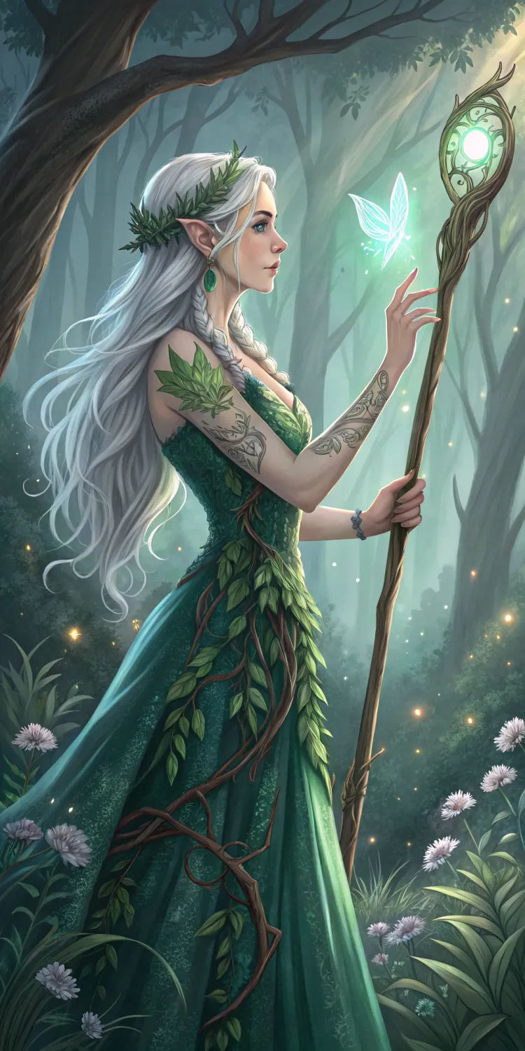 An ethereal illustration of a female character in a fantasy woodland setting. The character has flowing silver hair and is dressed in an emerald green gown adorned with leaves and vines. She holds a staff with a glowing crystal orb in her right hand. Her left hand is gently touching a floating butterfly. The character's skin is pale with a subtle luminescent glow, giving her an otherworldly appearance. A vine tattoo wraps around her forearm. The background is a mystical forest with dappled sunlight filtering through the canopy, creating a serene atmosphere. The overall style is soft and enchanting, with a focus on natural elements and magical lighting typical of fantasy art.