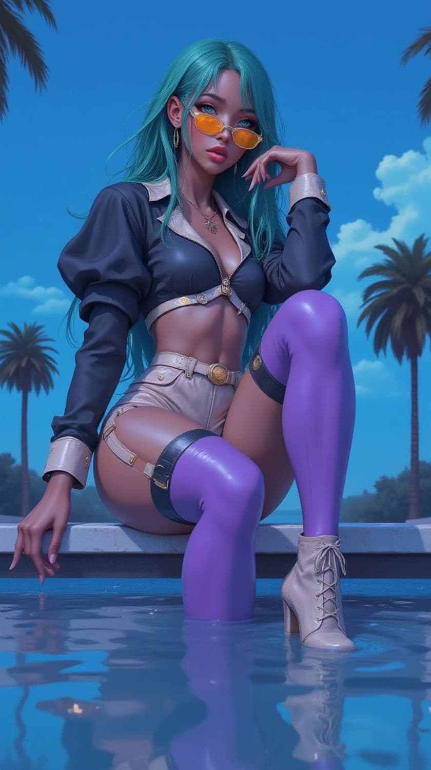 A stylish, futuristic figure with vibrant teal hair and reflective orange sunglasses poses confidently by a reflective body of water. She wears a form-fitting black top with cream shorts adorned with detailed brass buckles and straps. Her ensemble is completed with striking purple thigh-high boots and heeled shoes. Palm trees and a vibrant blue sky with scattered clouds provide a picturesque background.