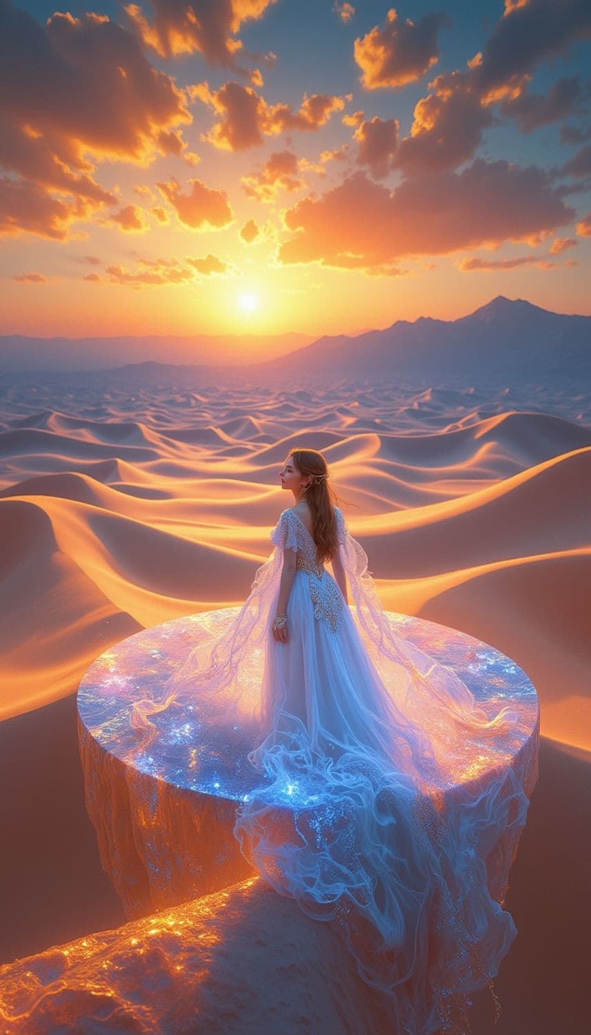 In a mystical, ethereal realm of floating, luminescent desert dunes under a sky painted with the colors of a radiant sunset, a captivating female figure stands poised on a shimmering, translucent sand platform. Her attire is a flowing, elegant robe crafted from a fabric that seems to capture the essence of desert twilight, blending shades of golden amber and shimmering copper. Her hair, a striking shade of sunlit bronze, cascades down her back in intricate, flowing braids, framing a face with delicate, serene features and a gentle, confident smile. Her eyes, a mesmerizing shade of desert topaz, seem to reflect the mysteries of the arid world. She wears a delicate circlet adorned with tiny, luminescent sunstones and golden vines, enhancing her celestial and otherworldly presence. The background is a breathtaking scene of luminescent desert dunes and gentle, glowing streams that weave through the realm, creating a serene and enchanting atmosphere. The style is a blend of fantasy and desert elegance, with a focus on warm color tones and intricate detailing, creating a mesmerizing and otherworldly atmosphere.