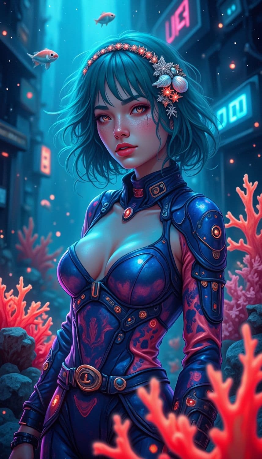 In a futuristic, neon-lit underwater city, a captivating female figure stands amidst a vibrant coral garden illuminated by the glow of bioluminescent sea creatures. Her attire is a sleek, form-fitting wetsuit crafted from a shimmering, iridescent fabric that captures the hues of the ocean depths, blending shades of aquamarine and deep indigo. Her hair, a striking shade of oceanic teal, flows freely around her, resembling the gentle currents of the sea. Her eyes, a mesmerizing shade of coral pink, seem to reflect the mysteries of the underwater world. She wears a delicate headpiece adorned with tiny, luminescent seashells and pearls, enhancing her aquatic and otherworldly presence. The background is a breathtaking scene of towering coral structures and gentle, glowing schools of fish that weave through the city, creating a serene and enchanting atmosphere. The style is a fusion of sci-fi and marine elegance, with a focus on vibrant color tones and intricate detailing, creating a mesmerizing and otherworldly atmosphere.
