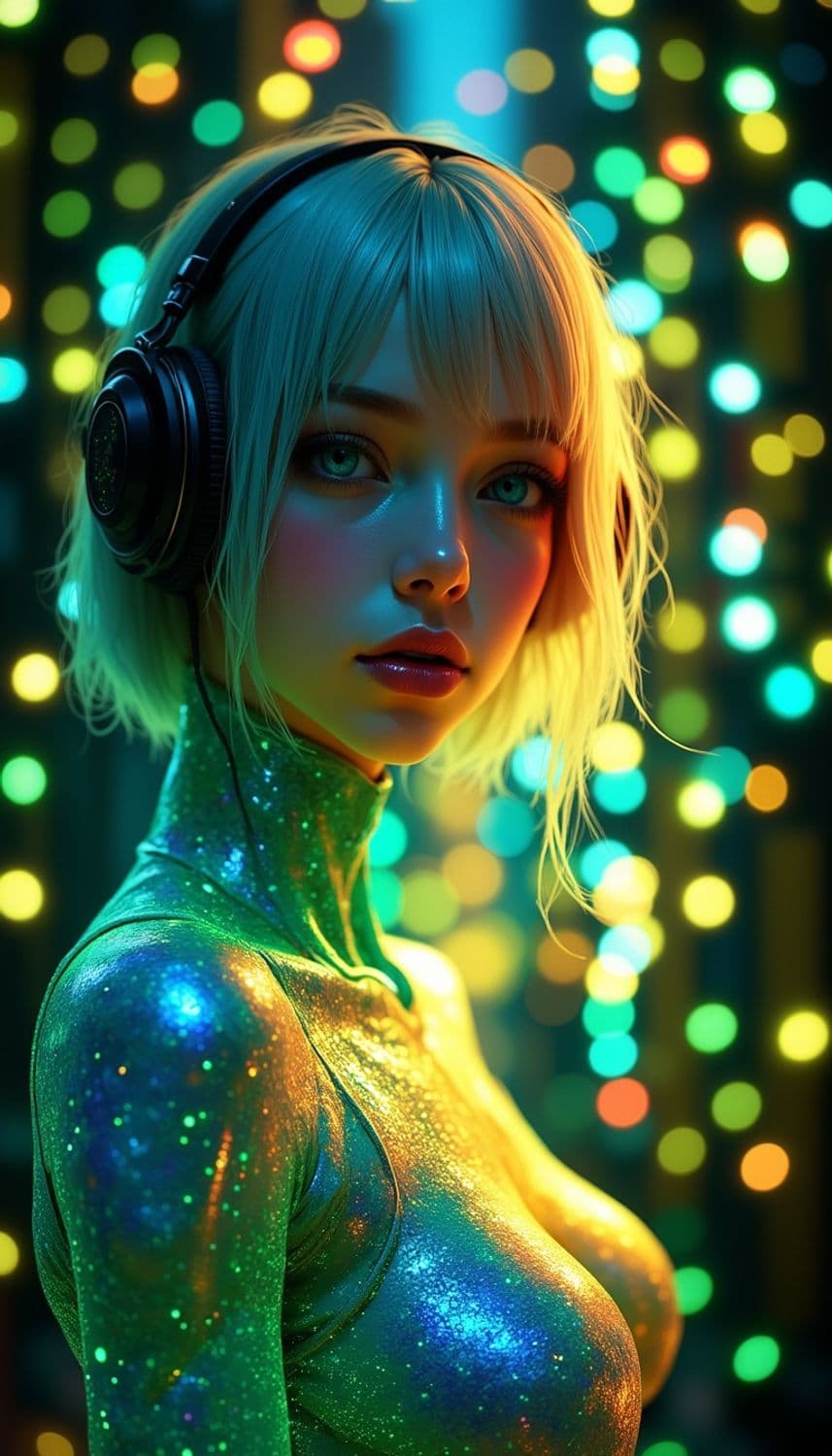 A futuristic woman with teal hair, wearing headphones, stands amidst a vibrant background of multicolored bokeh lights. Her shimmering, iridescent outfit reflects the play of light, creating a harmonious blend of colors. The setting is surreal and digital, evoking a sense of modernity and wonder.