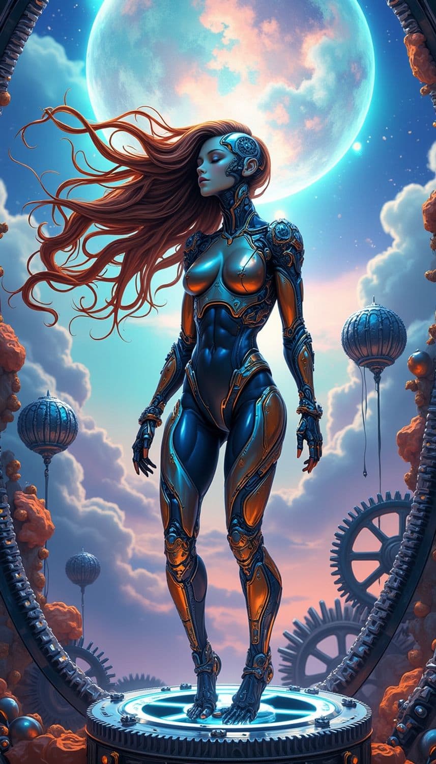 In a futuristic, ethereal realm of floating, luminescent gears under a sky filled with swirling, radiant energy waves, a captivating female figure stands poised on a gleaming, transparent gear platform. Her attire is a sleek, form-fitting suit crafted from a fabric that seems to capture the essence of mechanical elegance, blending shades of metallic bronze and shimmering cobalt. Her hair, a striking shade of gear copper, flows freely around her in a cascade of intricate, gravity-defying coils, framing a face with sharp, angular features. Her eyes, a mesmerizing shade of mechanical green, seem to reflect the mysteries of the clockwork universe. She wears a delicate headset adorned with tiny, luminescent gears and holographic displays, enhancing her celestial and otherworldly presence. The background is a breathtaking scene of floating gears and gentle, glowing streams of mechanical light that weave through the realm, creating a serene and enchanting atmosphere. The style is a fusion of sci-fi and mechanical elegance, with a focus on vibrant color tones and intricate detailing, creating a mesmerizing and otherworldly atmosphere.