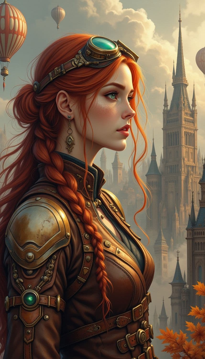 The image depicts a woman in a steampunk-themed outfit with a detailed leather jacket, intricate metallic ornaments, and goggles with a green lens on her head. Her long red hair is styled in a braid. She stands in front of a fantasy cityscape with towering spires and several hot air balloons floating in the cloudy sky. Autumn leaves are visible at the bottom, suggesting a seasonal atmosphere.