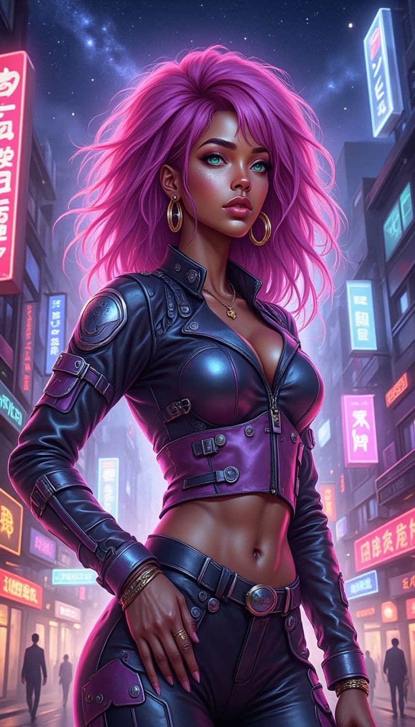 A striking character with vibrant pink hair stands confidently in an urban street setting at night. She wears a form-fitting black and purple leather jacket paired with matching pants. The backdrop features neon-lit signs, enhancing the futuristic city vibe. Her expression is focused, and she accessorizes with hoop earrings and bracelets.