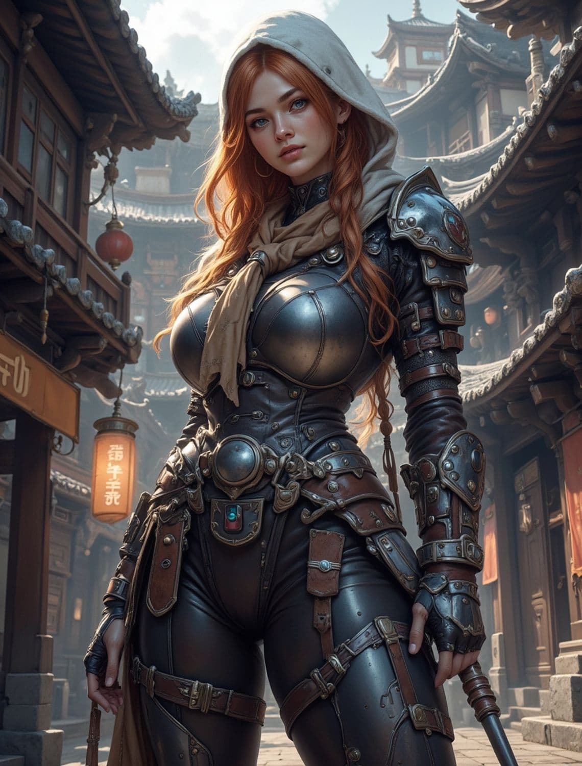 A red-haired female warrior stands confidently in a traditional Asian street, wearing detailed metal armor with leather accents. She has a neutral yet engaging expression and a hood drapes over her shoulders. The background features classic architectural elements with wooden structures and hanging lanterns.