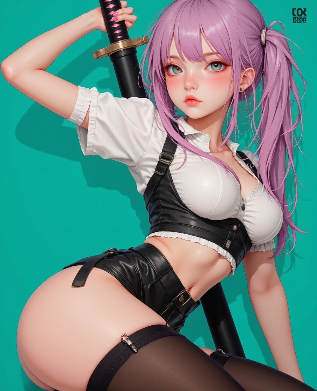 An anime-style character with long lavender hair is featured against a teal background. She is holding a sword over her shoulder and is dressed in a white, ruffled shirt with a black harness and shorts. Her pose highlights her confident demeanor.