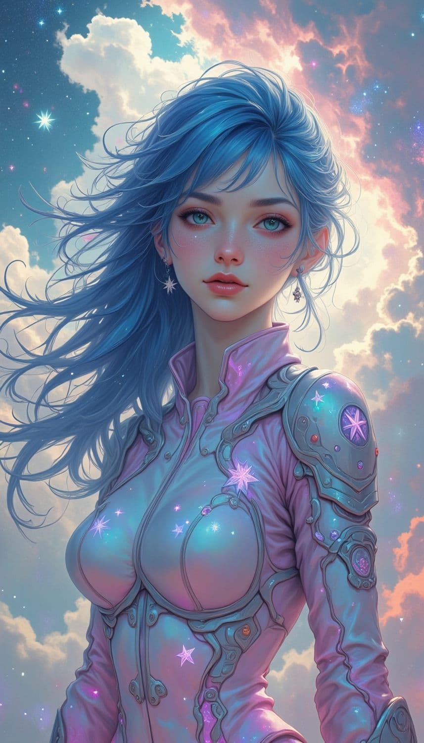 A mesmerizing image of a woman sporting vibrant blue hair that cascades in the breeze. She dons an intricately detailed futuristic suit in hues of purple and blue, adorned with star motifs that glow softly, complementing her ethereal appearance. Her eyes are large and expressive, adding to her celestial aura. The background is a dreamy sky with fluffy clouds and twinkling stars, creating a magical and otherworldly atmosphere.