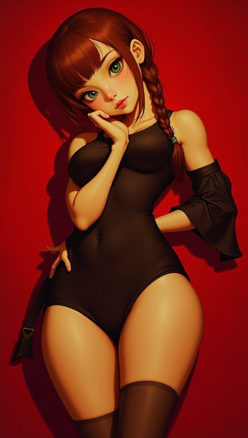 An anime-style character with long brown hair styled in a braid wears a black outfit. She poses against a vibrant red background, showcasing her large green eyes and a contemplative expression. The lighting accentuates her features and the soft shadows cast on the wall behind her.