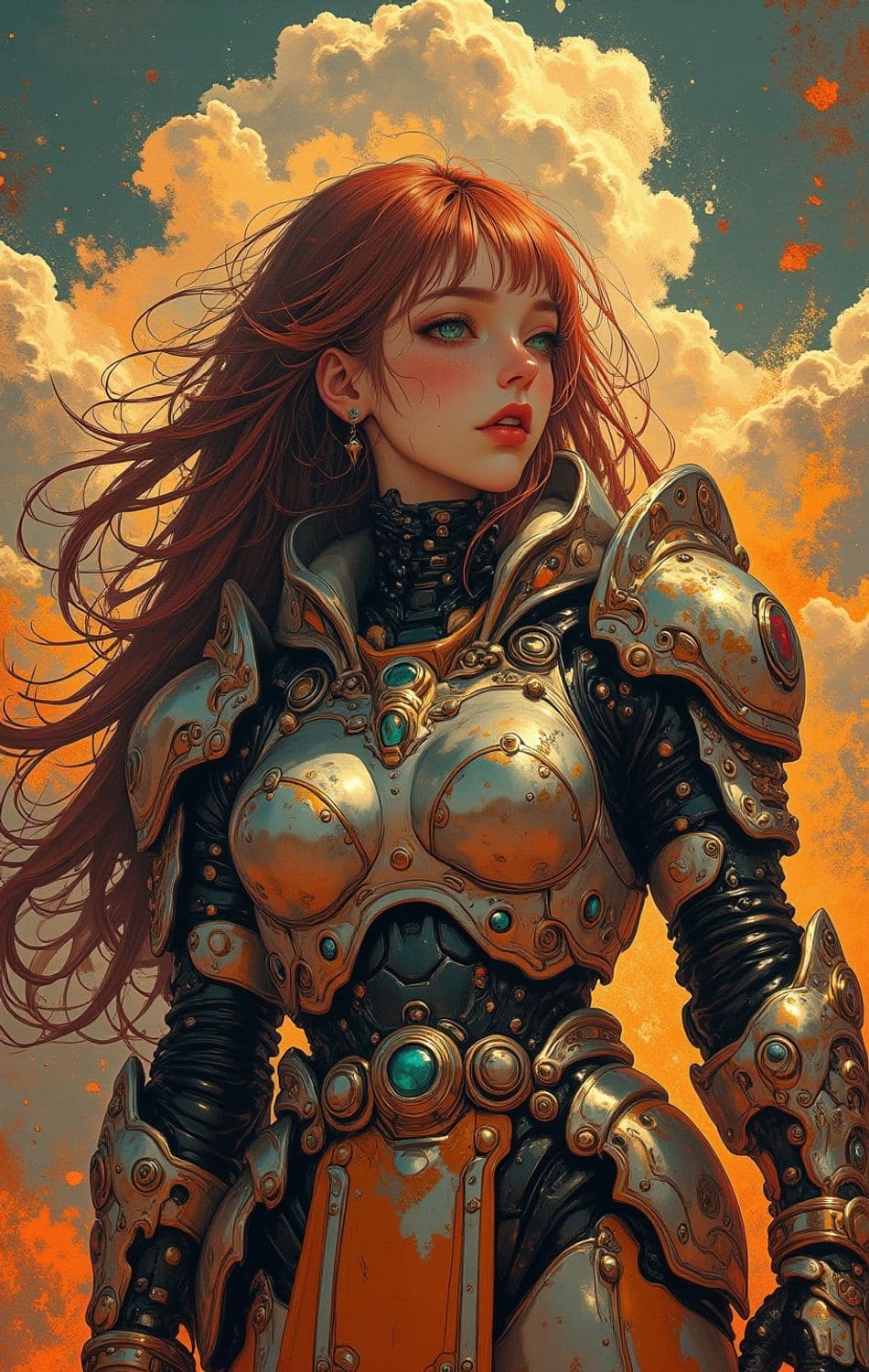 The image features a young woman with flowing red hair wearing intricately designed silver armor, adorned with turquoise gems. She stands against a backdrop of dramatic, glowing clouds that illuminate her figure. Her expression is one of determination and strength, adding a sense of mystique and power to the scene.