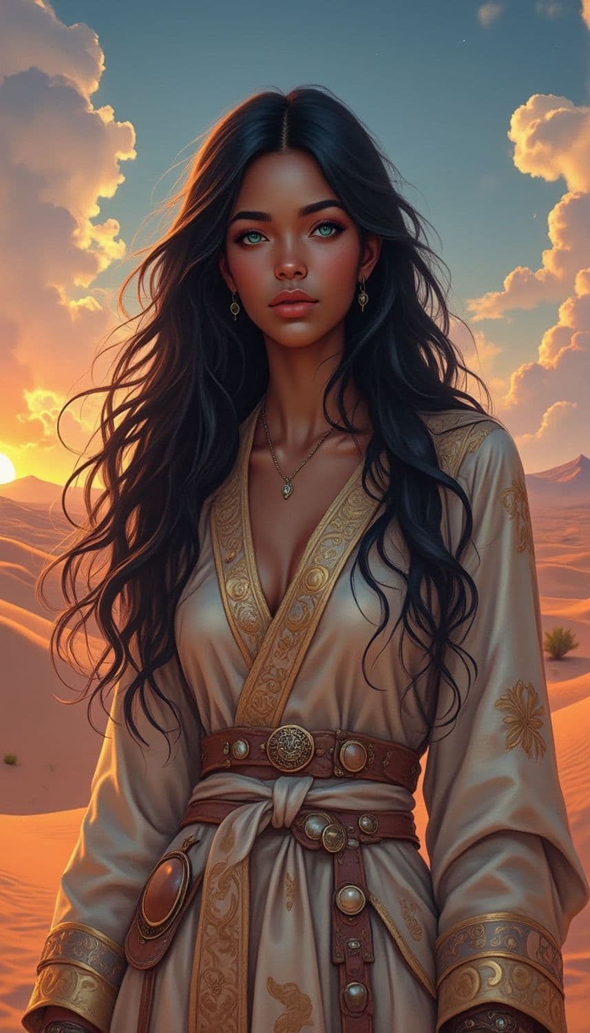 The image features a beautiful woman with dark skin and shoulder-length, curly auburn hair, standing against a backdrop of a desert landscape during sunset. The sky is painted with warm tones of orange, pink, and blue, with soft, fluffy clouds that reflect the sun's golden light. The woman's attire is an intricately designed robe with patterns in gold and brown hues, giving an impression of elegance and tradition. Her robe is tied at the waist with a sash, and she wears delicate jewelry, including earrings and a pendant necklace. Her eyes are a striking shade of green, adding a touch of enchantment to her gaze. The overall style of the image is a blend of realism and fantasy, with highly detailed features and a soft, dreamlike color palette that creates a serene and mystical atmosphere.