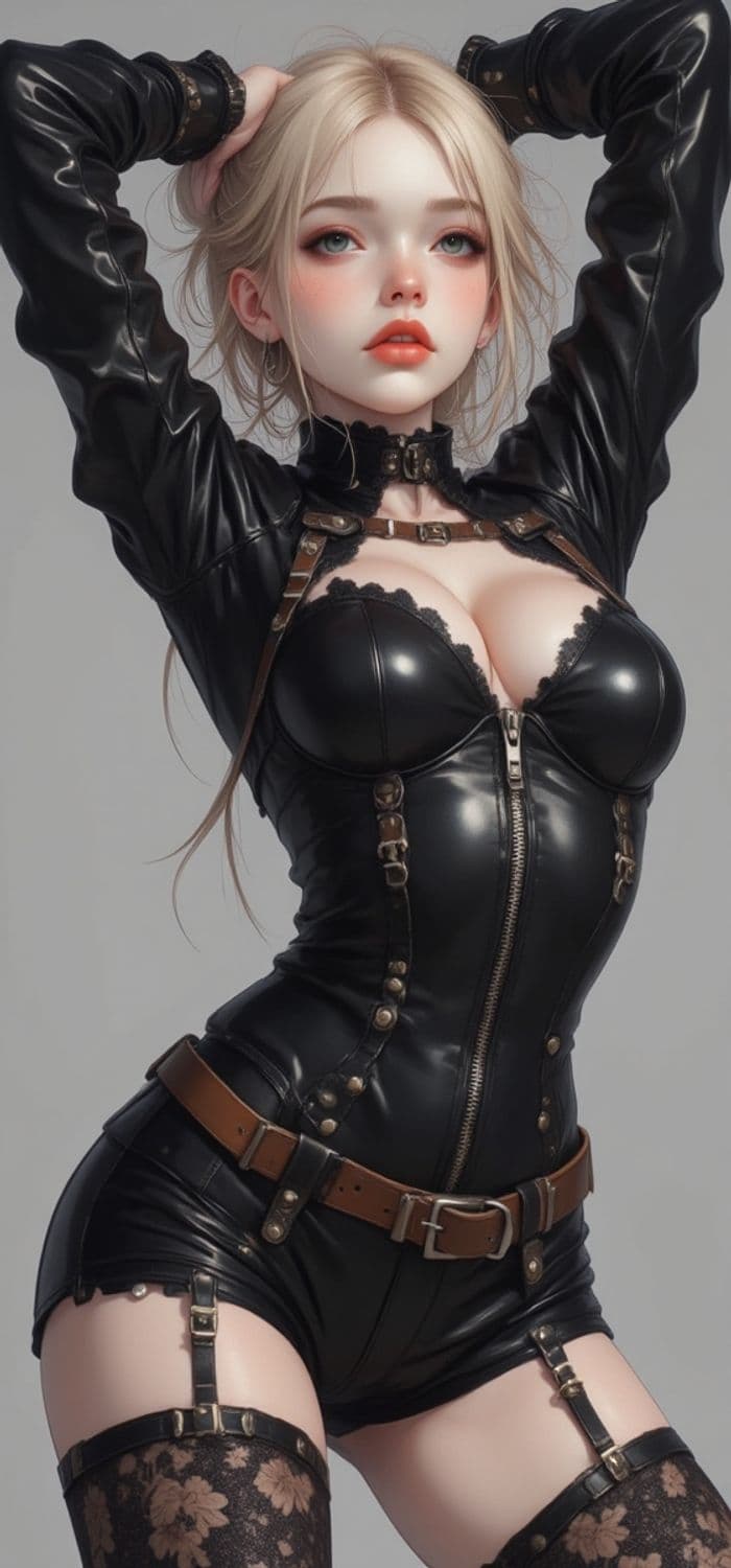 The image is a digital artwork depicting a woman with auburn hair styled in loose, cascading waves. She is dressed in a shiny black latex outfit that includes a form-fitting, long-sleeved top with lace detailing and a front zipper. The top has a deep neckline accentuated with lace, and the outfit is further detailed with straps and buckles. She wears high-waisted black shorts with garter straps connected to sheer black stockings that have a floral lace pattern at the top. The background is a plain grey, highlighting the subject, and the style is characteristic of anime or manga influences with a smooth, realistic finish and a focus on glossy textures and subtle shading.