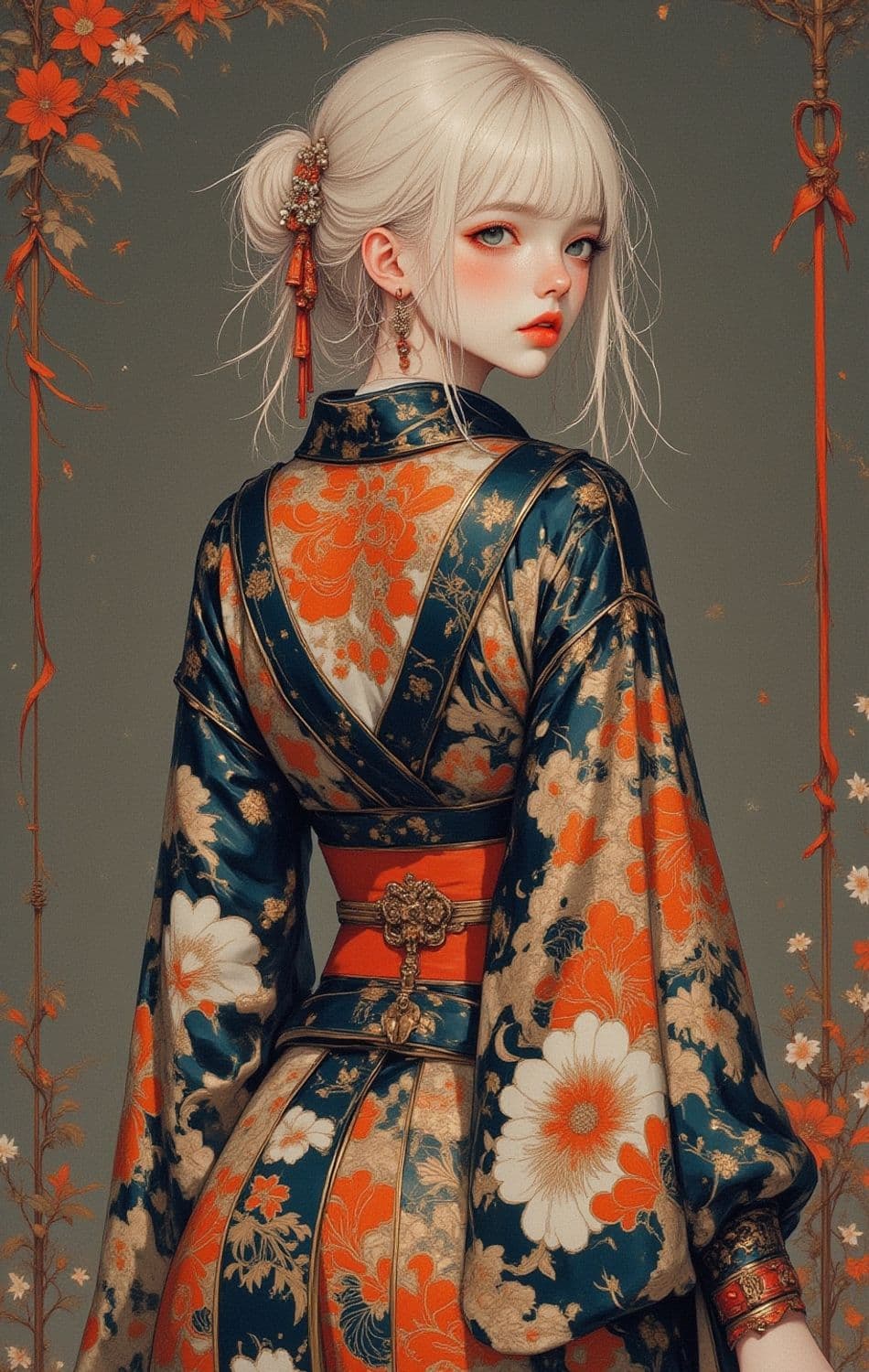 A young woman with delicate features is turned slightly to the side, gazing back over her shoulder. Her platinum blonde hair is styled into an elegant updo adorned with floral and metallic hairpieces. She wears a richly decorated kimono with intricate floral patterns in vibrant orange, gold, and navy blue hues. The background is subtly decorated with floral motifs and strands of orange ribbon, enhancing the overall ornate aesthetic.