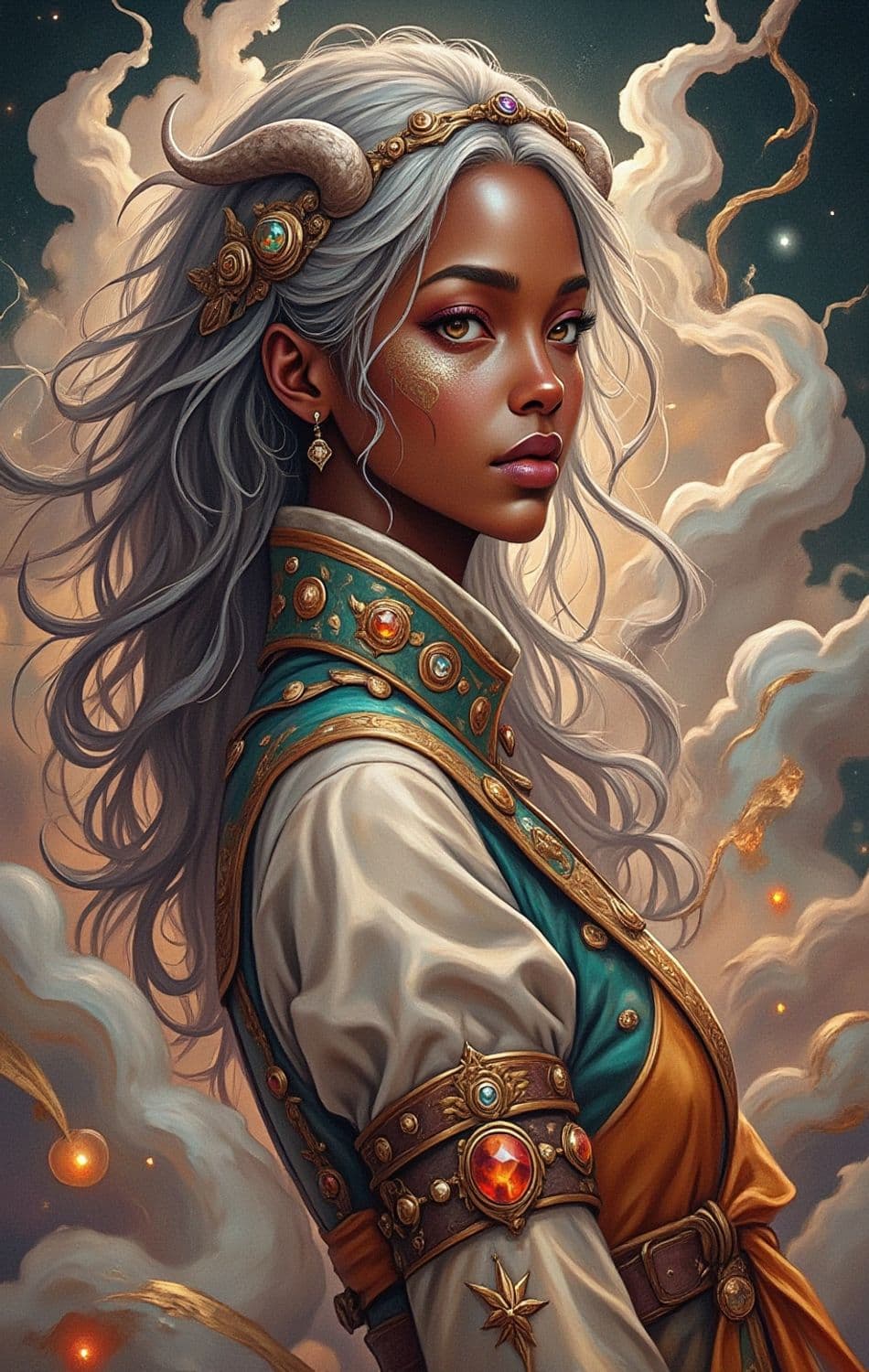 A mystical figure with long silver hair and intricate jewelry is portrayed against an ethereal backdrop. She wears a regal, embellished garment with golden and jeweled accents, and a pair of elegant horns adorns her headpiece. The atmosphere around her is filled with swirling clouds and glowing particles, enhancing the magical aura.