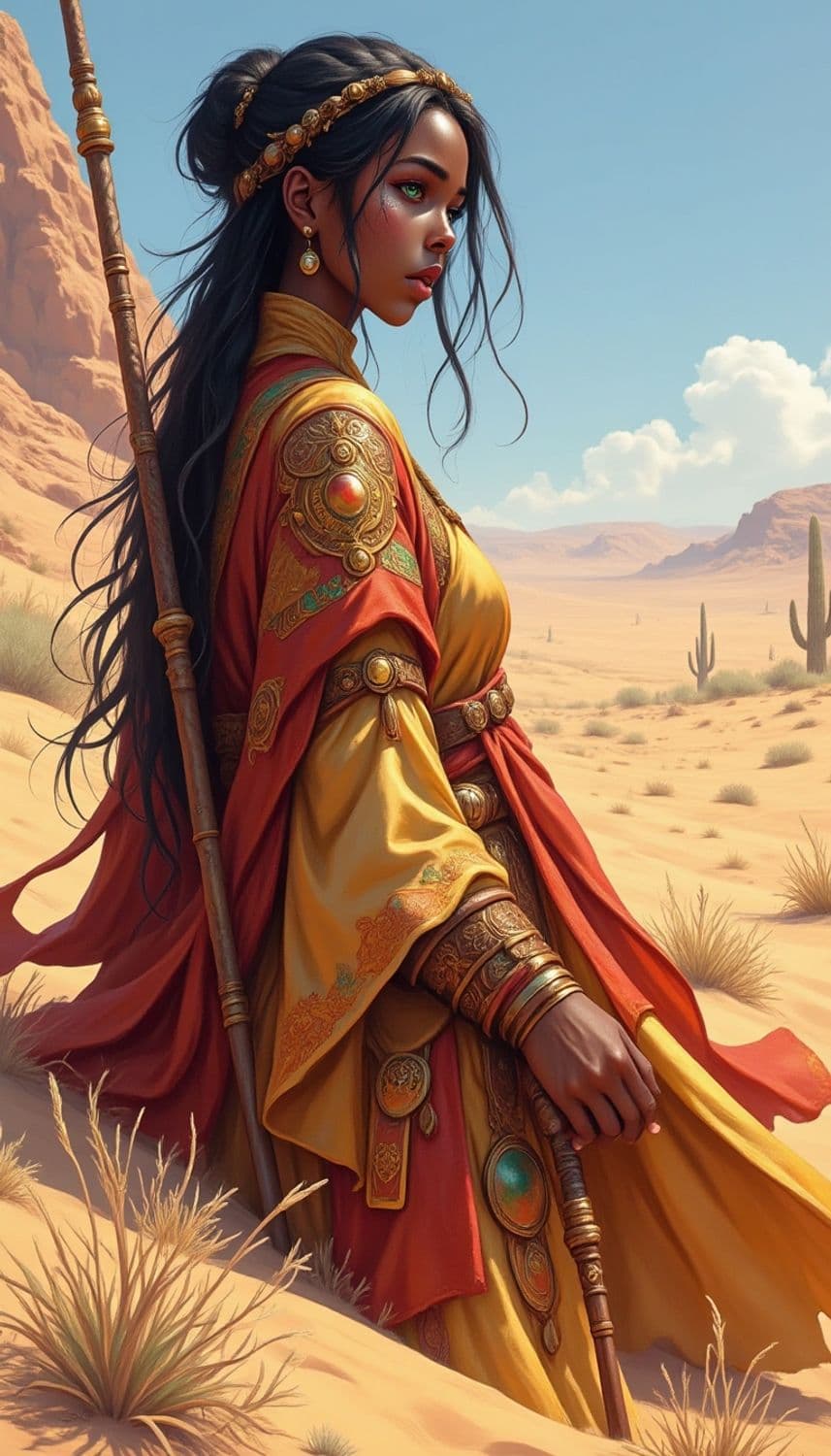 The image depicts a woman in a vibrant desert setting. She wears ornate, historical attire with rich reds and golds, adorned with intricate patterns and jewelry. Her dark hair flows down her back, and she carries a wooden staff. The background features vast sandy dunes and tall cacti under a clear blue sky.