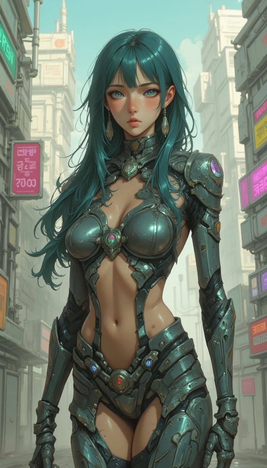 A futuristic female warrior stands confidently in a bustling urban environment. She has long teal hair and striking eyes, wearing an intricately designed metallic armor that glows with colorful gems. The background features tall buildings with neon signs in an unknown language, adding a cyberpunk aesthetic.