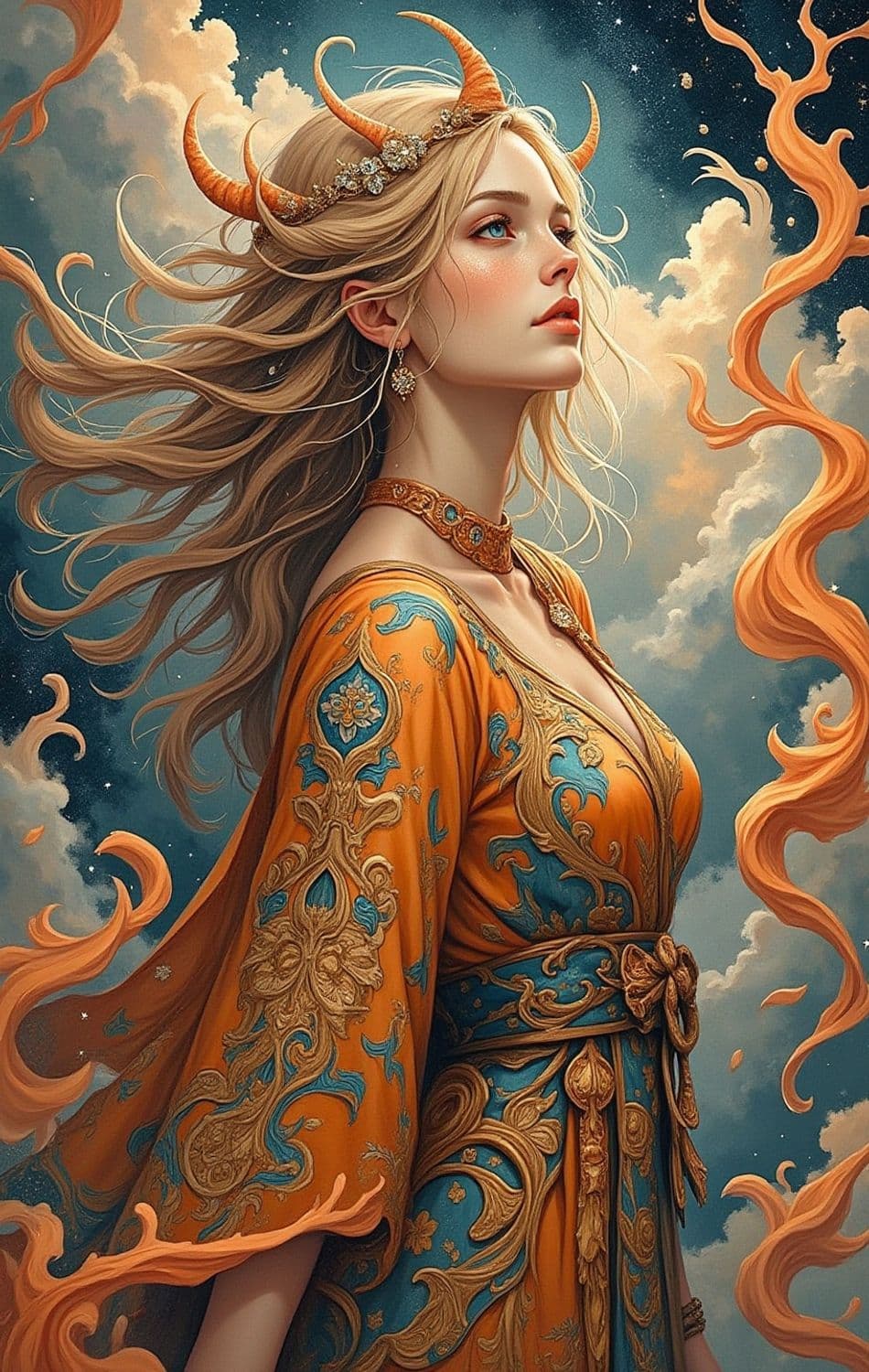 A mystical woman with flowing hair adorned with a jeweled headdress resembling horns stands against a celestial background. She wears an intricately designed orange and blue robe with golden floral patterns. Wisps of ethereal energy seem to flow around her, adding to her enchanting presence.