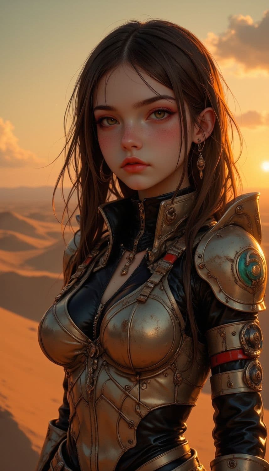 A young woman with long brown hair stands confidently in a desert landscape. The ethereal golden sunset bathes her surroundings in warm hues. She wears intricate armor with metallic golden accents, adorned with delicate details. Her expression is thoughtful, highlighted by her striking eyes and subtle makeup, reflecting an aura of both strength and elegance.
