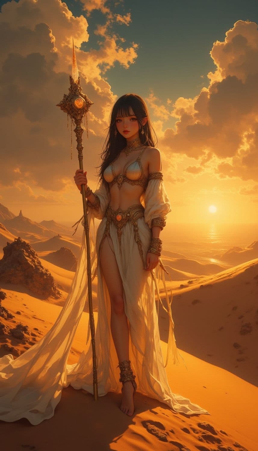 A mystical woman stands on a dune under a glowing sunset, her luxurious golden attire adorned with intricate jewelry. She wields an ornate staff topped with a radiant gemstone. The sky is painted with dynamic clouds, enhancing the enchanting atmosphere.