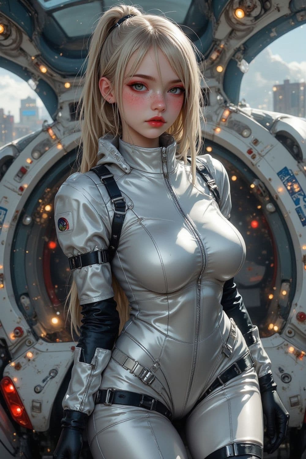 A futuristic scene featuring a woman with long blonde hair and striking facial features, dressed in a form-fitting, silvery spacesuit. She stands confidently in front of a high-tech, oval-shaped hatch that seems to belong to a spacecraft, with cityscape elements in the background. Her suit has black accents and buckles, adding to the sci-fi aesthetic.