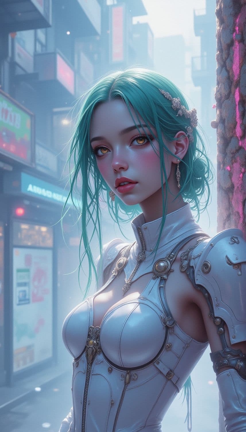 A captivating character with bright teal hair styled elegantly, adorned with a delicate hairpin. She is dressed in a futuristic armored outfit, featuring ornate metallic details. Her striking amber eyes and subtly blushed cheeks create an enchanting presence. The background is set in a neon-lit cityscape with soft pastel colors, enhancing the dreamlike ambiance.