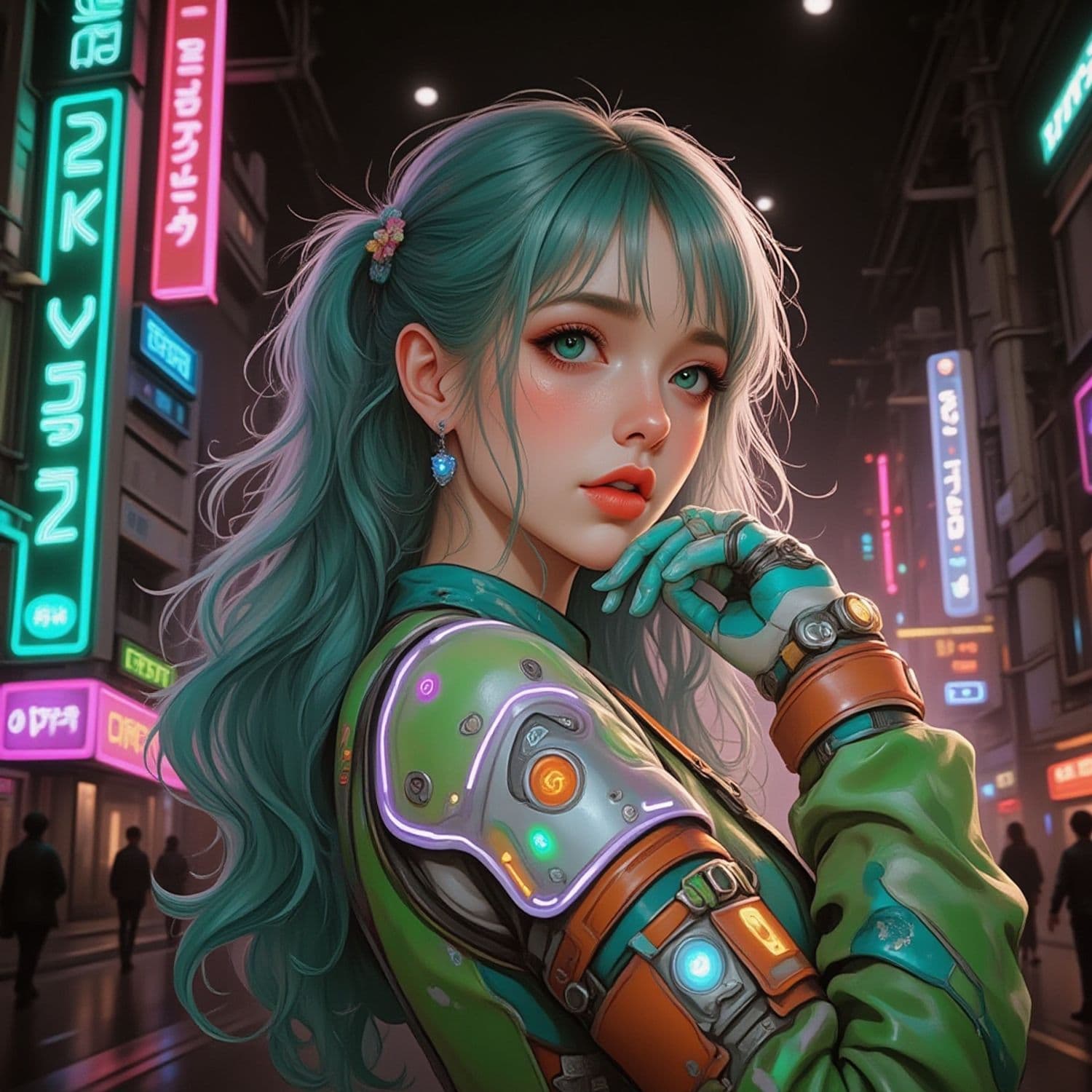 The image features a futuristic, cyberpunk scene with a young woman in focus. She has long, teal-colored hair styled in a playful ponytail and wears an outfit with neon-lit technological armor on her arm. Her expression is contemplative, gazing to the side while her hand is poised near her face. The background is an urban setting with vibrant neon signs and a cityscape at night, giving a sense of a bustling futuristic metropolis.