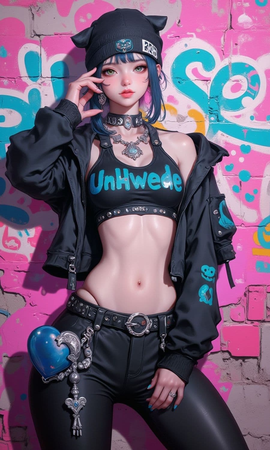 A stylish anime character posing confidently against a backdrop of vibrant graffiti art. She sports a dark ensemble with a cropped jacket, a beanie with cat ears, and a top emblazoned with a unique logo. Her accessories include a bold choker, earrings, and a heart-shaped ornament attached to her belt, adding flair to her urban streetwear look.